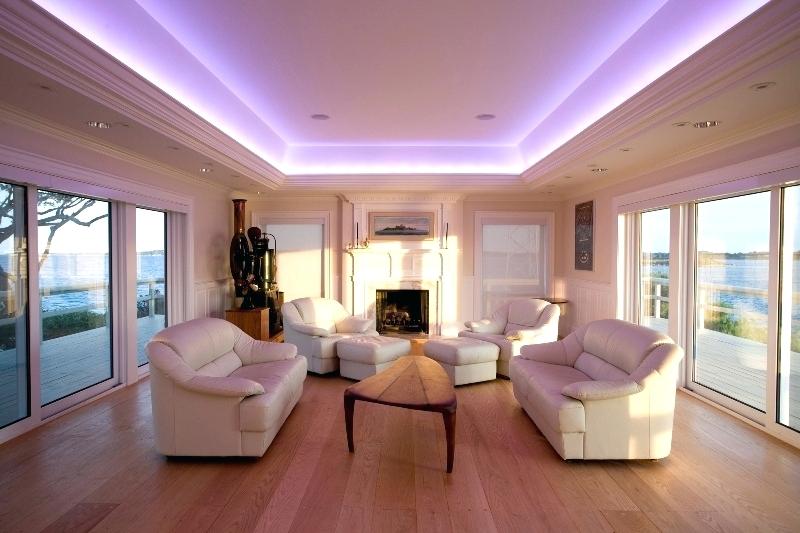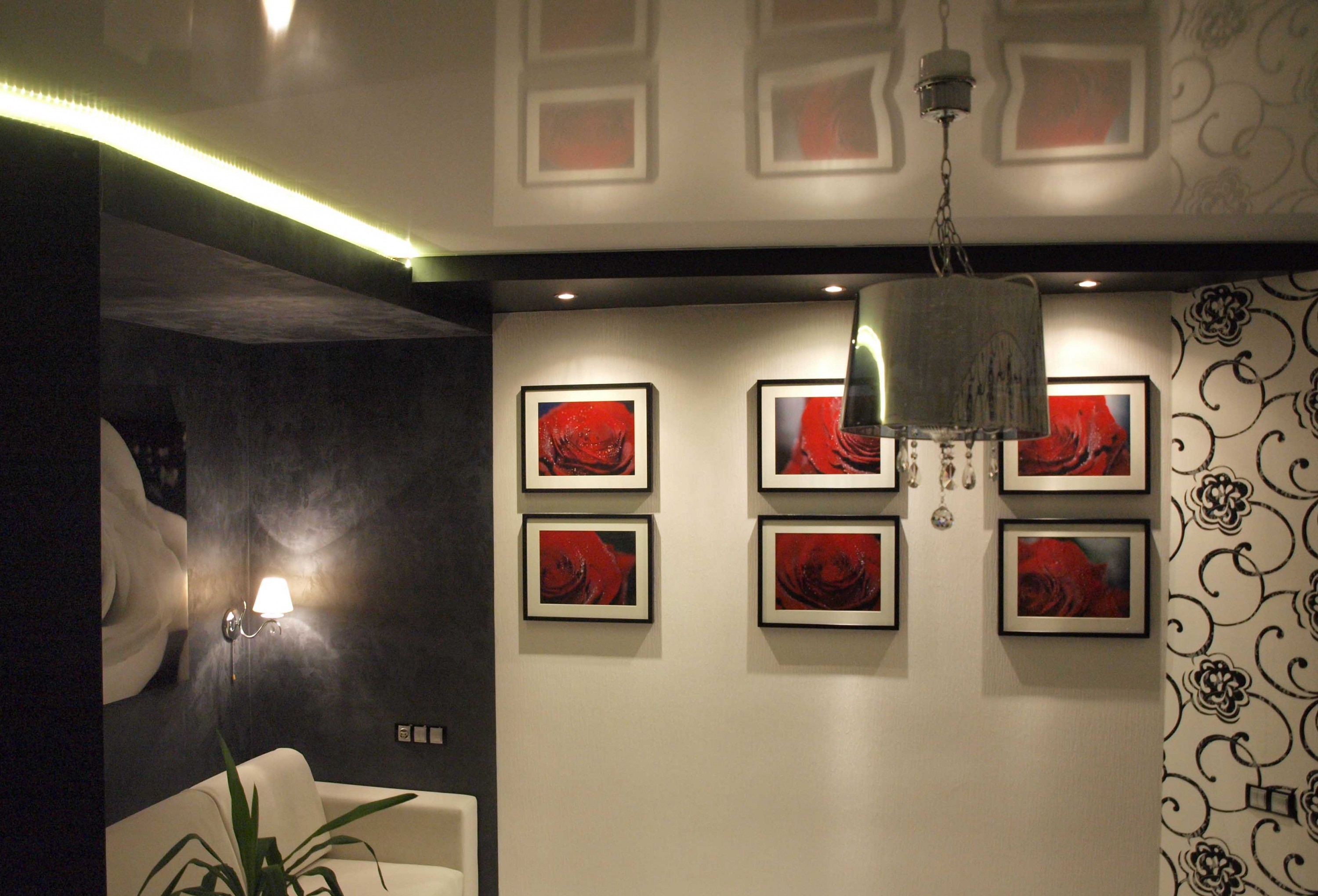 - L’éclairage avec des LED cachées derrière la plinthe du plafond sera un excellent ajout à l’éclairage principal avec des spots ou un lustre central chic;