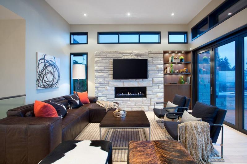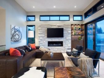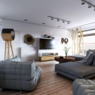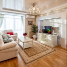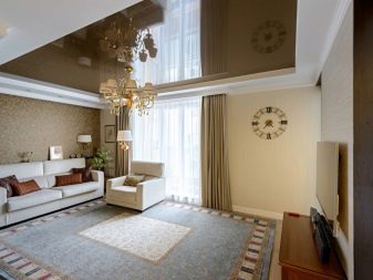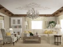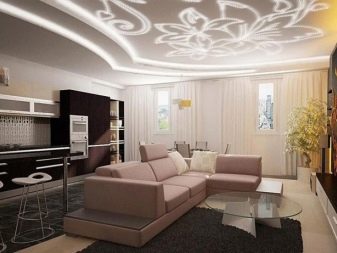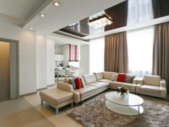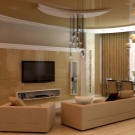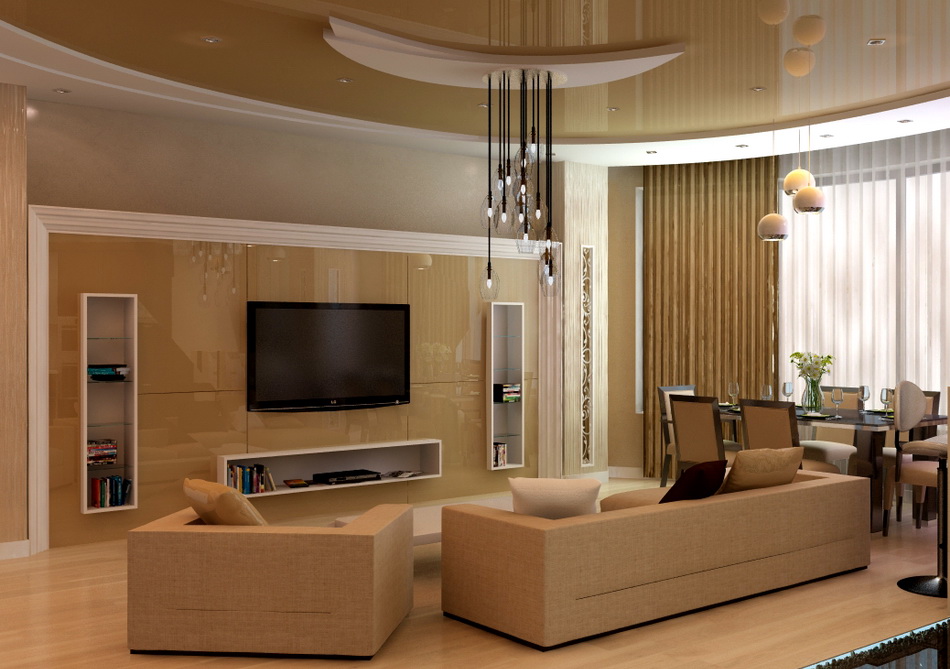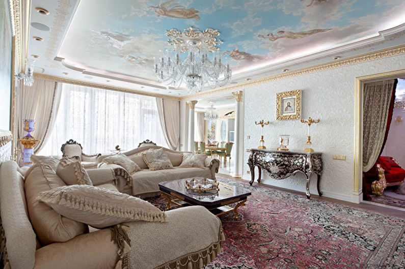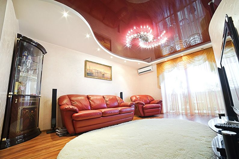 Cette pièce est le cœur de toute maison et de sa carte de visite. C'est l'endroit où vous devez démontrer le maximum de possibilités créatives. Le design est sélectionné de manière à ce que tout le monde aime le design et soit associé à la maison. S'il y a beaucoup de pièces et d'accessoires dans la pièce, des solutions concises sont choisies pour décorer le plafond, en mettant l'accent sur l'éclairage composite. Lorsque l'espace et le nombre d'éléments intérieurs le permettent, la conception est réalisée sous la forme de structures à deux niveaux avec un contraste de nuances de chaque niveau.