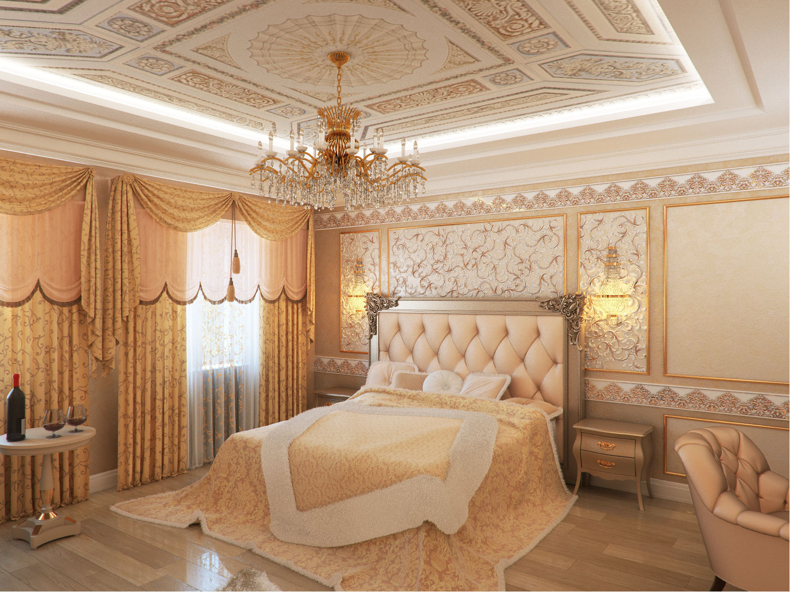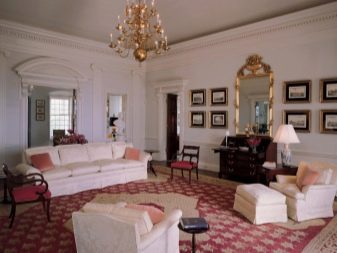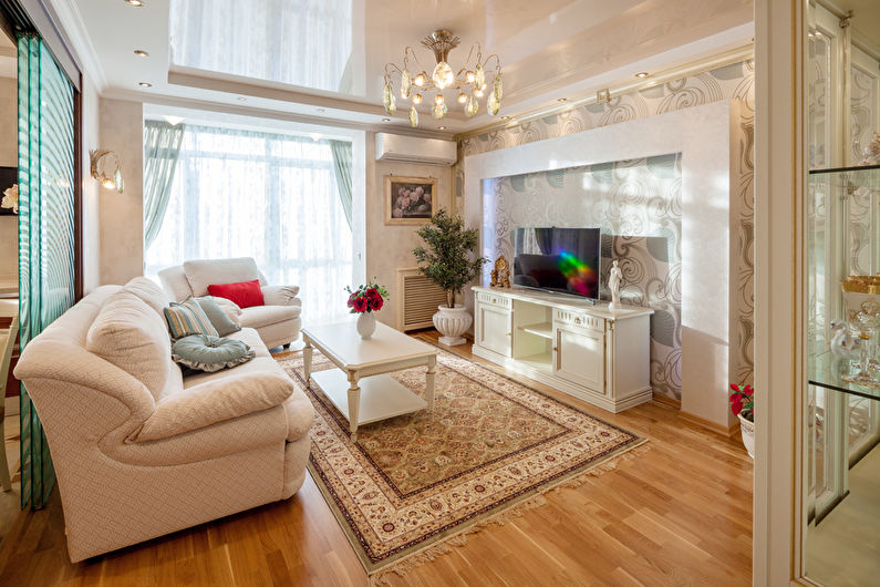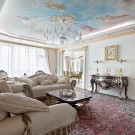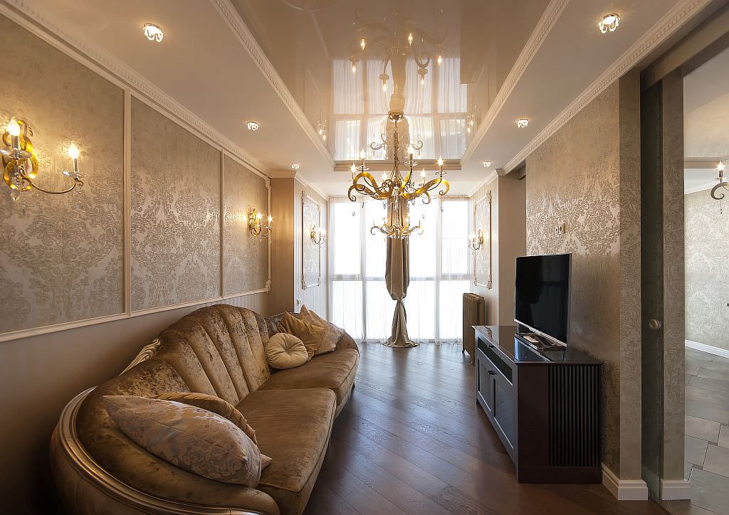 Directions classiques (classique, néoclassique, classicisme, style italien), il est important que la texture de la matière soit mate. Dans le même temps, afin de conserver les attributs stylistiques nécessaires, la surface doit être décorée avec des éléments imitant le stuc de plâtre ou des dorures. Par conséquent, des toiles souvent étirées décorent le décor sous cette texture (moulures de plafond, éléments pour lustres et coins décoratifs).