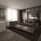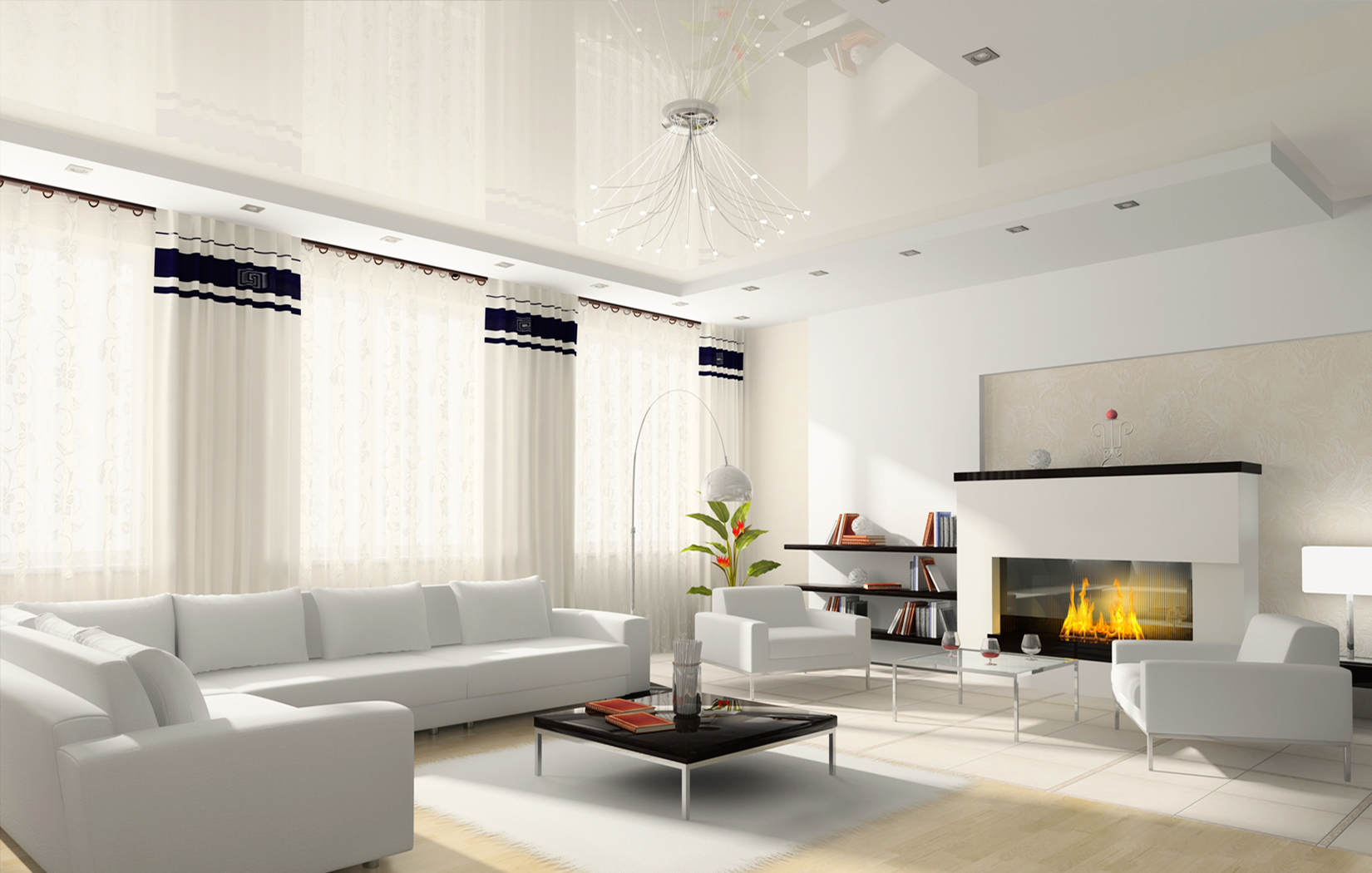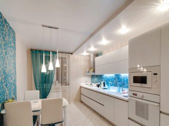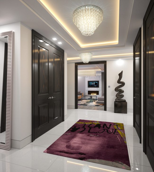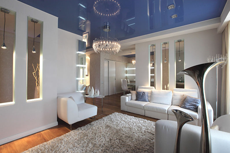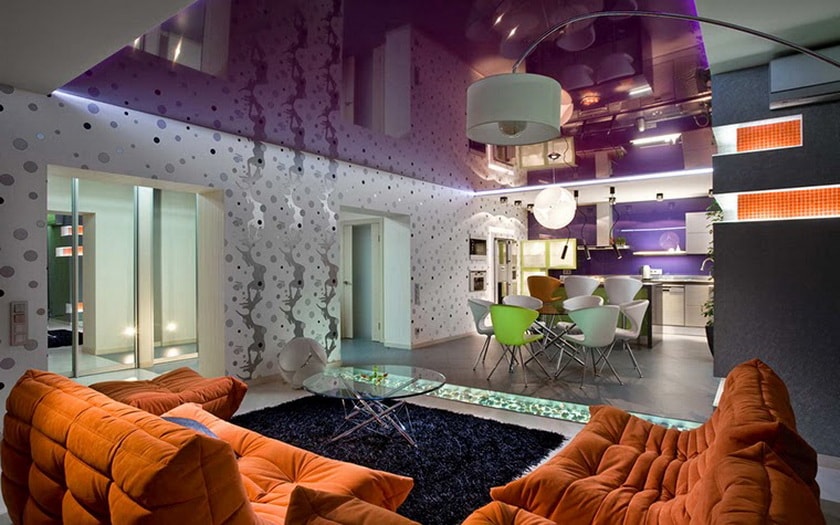 Un aspect important est la combinaison du plafond avec le concept de design global. Pour les tendances modernes (par exemple, minimalisme, technologie de pointe, moderne, bionique, brutalisme), il est important d'utiliser des matériaux modernes et une texture brillante.