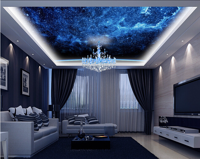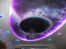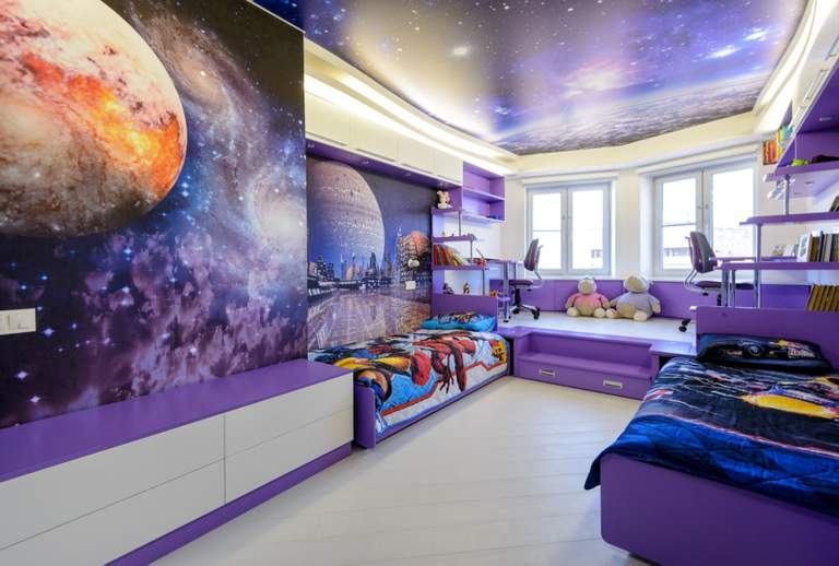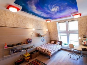 Il convient de combiner la structure de tension avec le matériau du mur. Questions et âge de l'enfant.Si le papier peint a une image, vous ne devez pas surcharger la toile du plafond avec la présence du motif. Si l'intérieur est fait dans un style moderne, il y a un papier peint sans motif avec une texture en relief sur les murs, vous pouvez faire une solution élégante, par exemple, sous la forme d'un ciel étoilé ou de l'espace.