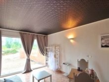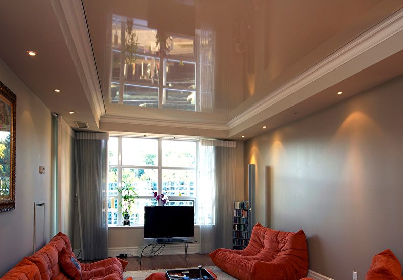 Le film est généralement déjà en largeur (3,5 m), utilisant souvent la technologie de couture pour de tels plafonds. Sa texture brillante peut augmenter visuellement l'espace, mais l'effet miroir reflète sur la surface tout ce qui se trouve en dessous, de sorte qu'un tel plafond exclut parfois un décor supplémentaire à l'intérieur.