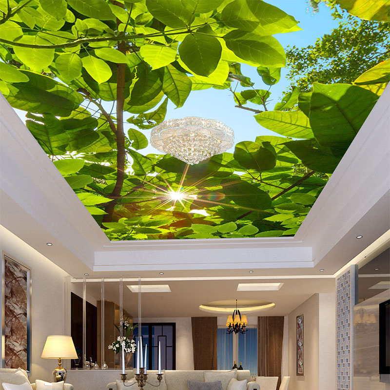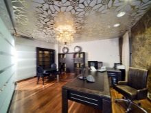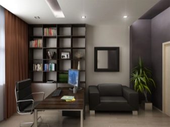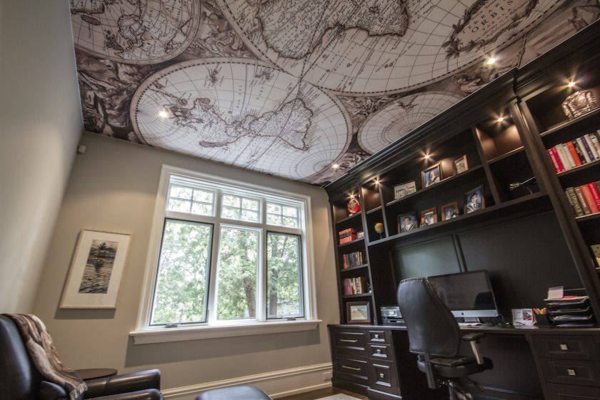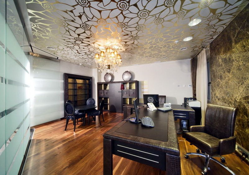Dans la conception du plafond de la toile de bureau de tension utilisant des solutions simples. Parfois, le dessin utilise l’impression de photos avec l’image de cartes.Cependant, cette technique est capable de surcharger l'espace avec une abondance de petits détails (par exemple, des livres situés sur les étagères des étagères).