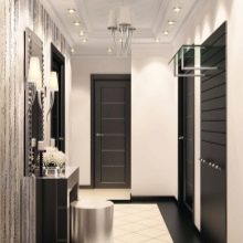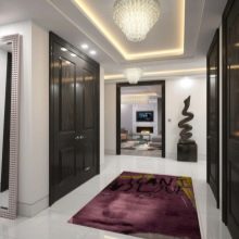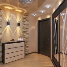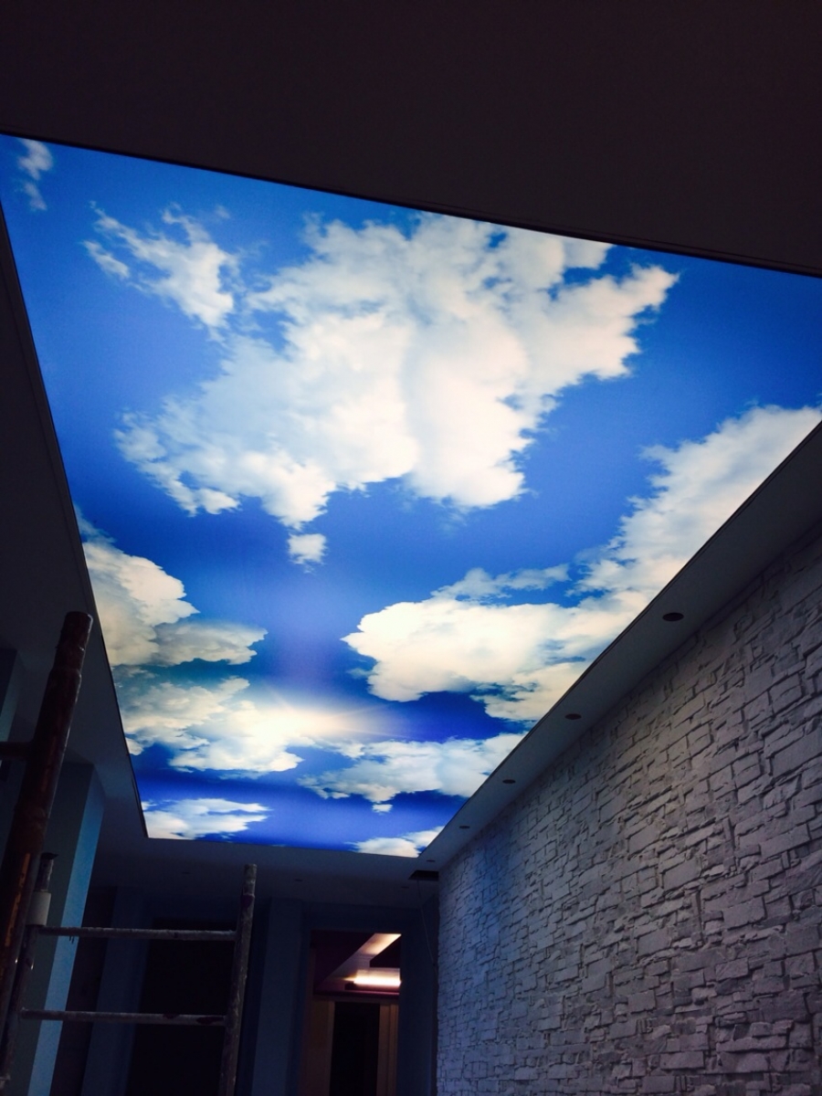 Ces salles sont souvent dépourvues de lumière naturelle et sont limitées en métrage. Le plafond en eux devrait être concis. Comme il y a généralement beaucoup d'éléments dans le couloir, la texture de la surface doit être mate: l'effet miroir associé à l'augmentation de l'espace le remplira d'un sentiment de confusion reflétant tout ce qui se trouve en dessous. Une solution intéressante pour ces salles sera l’impression photo avec une image du ciel.