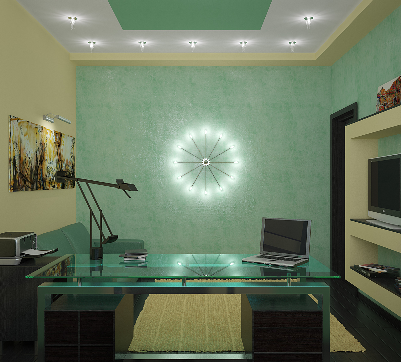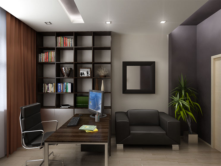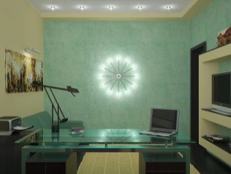 Pour plus d’harmonie, évitez les éclairages massifs: dans le bureau, il est préférable de placer de modestes projecteurs sur le pourtour du plafond, installés à différents intervalles pour un éclairage uniforme de la pièce.