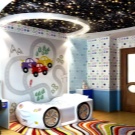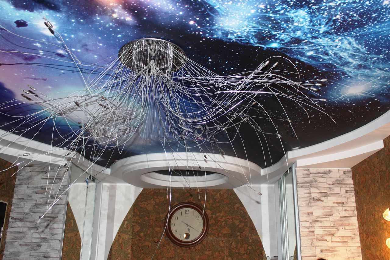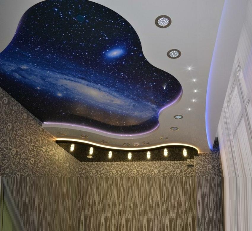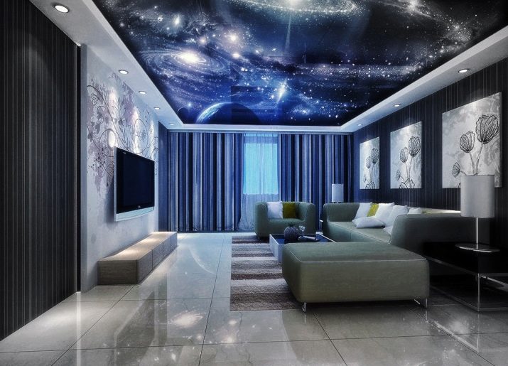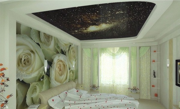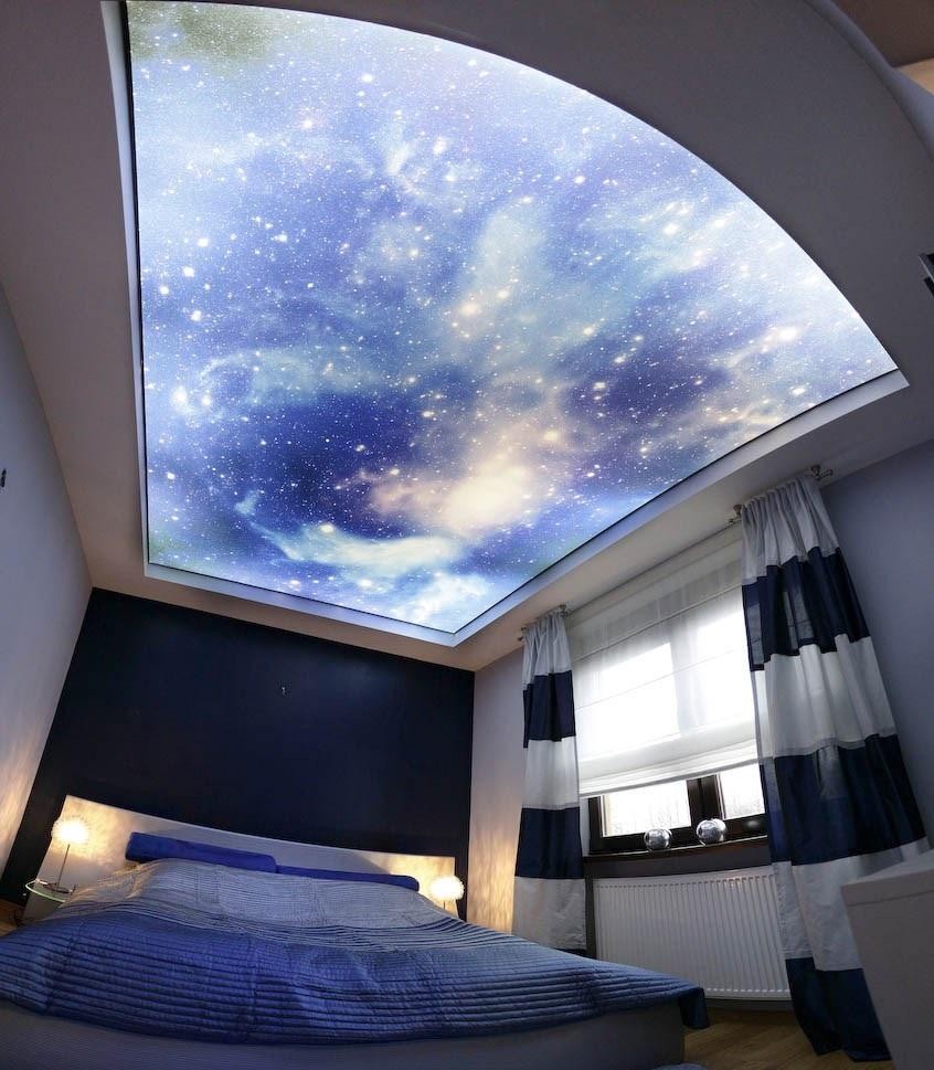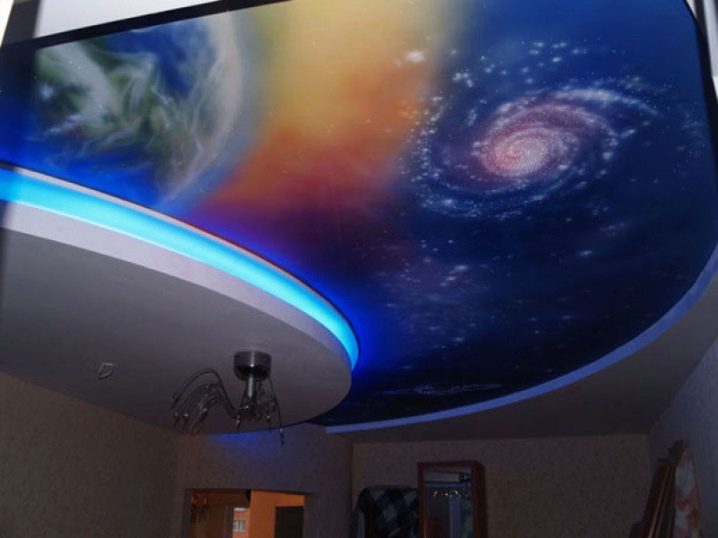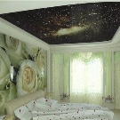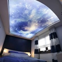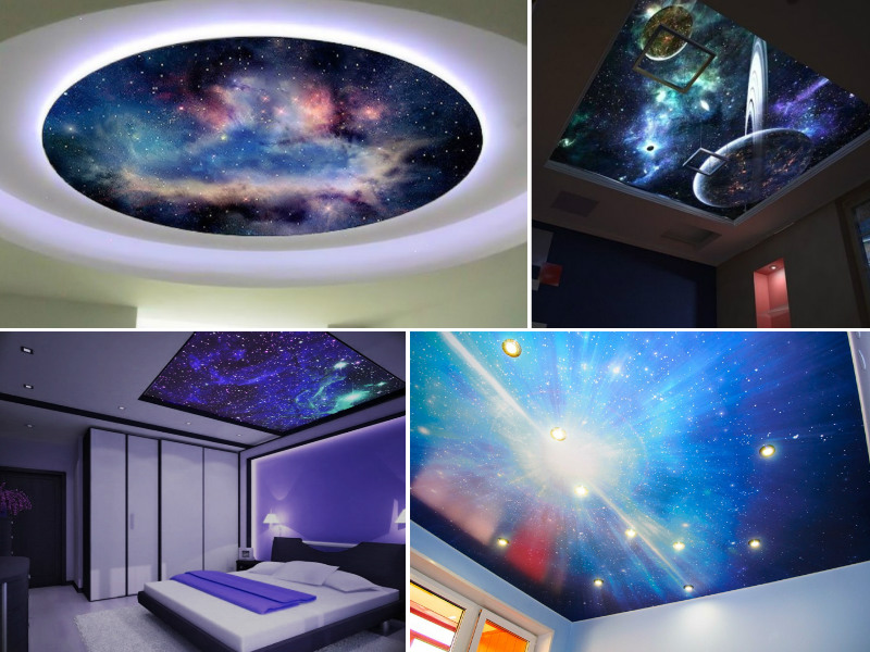 Il peut être fabriqué sur une toile en PVC ou sur un plafond en tissu avec un effet brillant. Dans ce contexte, différents corps cosmiques sont appliqués - étoiles, comètes, galaxies, constellations, Voie lactée - vous pouvez choisir dans le catalogue proposé par le fabricant ou apporter votre propre image.