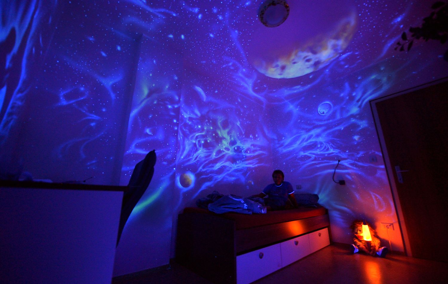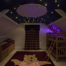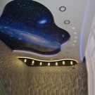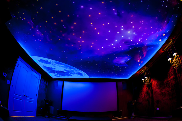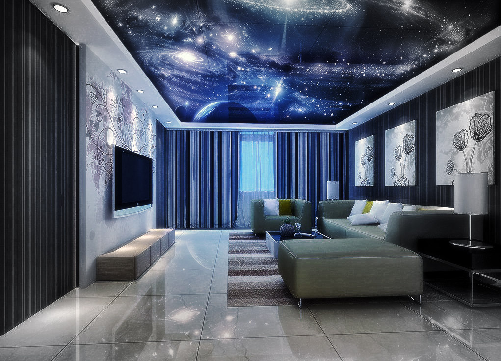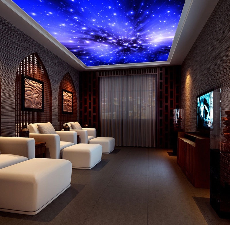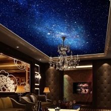Ceci est un autre moyen économique et très populaire pour les clients de créer un ciel étoilé. En fait, il s'agit de la même impression photo sur la toile, mais uniquement avec l'utilisation d'une peinture luminescente transparente, qui est invisible à la lumière du jour, mais qui brille très bien avec l'obscurité.