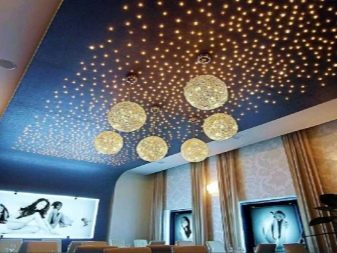 Les options pour diversifier la conception du plafond tendu avec des étoiles peuvent être nombreuses. Les capacités techniques modernes vous permettent de créer un ciel nocturne avec des effets spéciaux fantastiques. Par exemple, au lieu d'un tissu en PVC, vous pouvez utiliser une base en tissu pour le plafond. Il est considéré comme plus écologique.