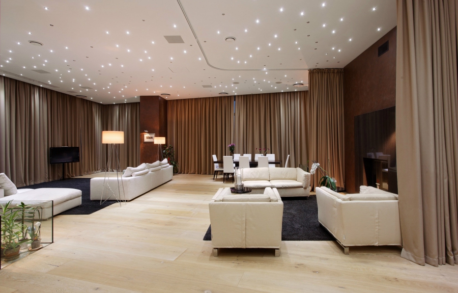 - Conception universelle. Des plafonds ayant l’effet d’étoiles scintillantes dans toutes les pièces, qu’il s’agisse d’un luxueux salon dans un manoir pompeux ou d’un petit studio dans un quartier résidentiel de la ville. Certains clients installent un tel miracle, même dans le couloir et la salle de bain. De plus, le plafond étoilé convient aussi bien à l’intérieur de tous les styles: des classiques intemporels aux technologies de pointe.