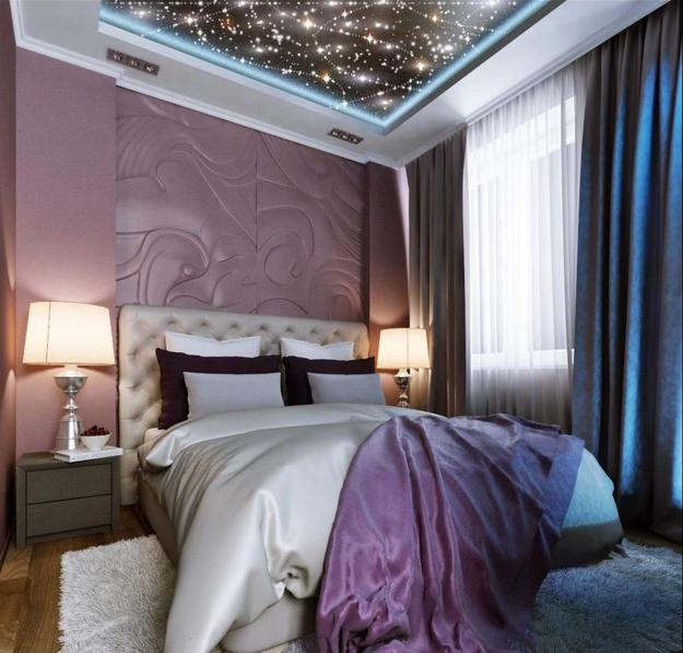 Le moyen le plus simple de diversifier la conception d'un plafond en étoile consiste à utiliser une palette de couleurs différente pour la base. Le fond général du ciel lui-même ne doit pas nécessairement être noir.Il peut être bleu foncé, violet, bleu clair, rose tendre, beige et même blanc.