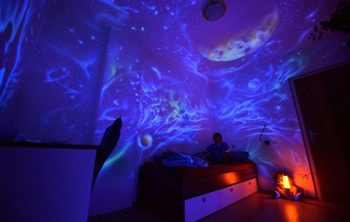 Renforcez l'effet lumineux avec des appliques muralessitué autour du périmètre de la pièce et projeté au plafond. Ce décor ne sera pas trop intrusif - la lueur de la peinture sera pâle et pas très longue. Par conséquent, si vous ne pouvez pas dormir avec les lumières allumées, il suffit de cliquer sur le commutateur.