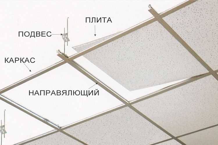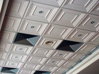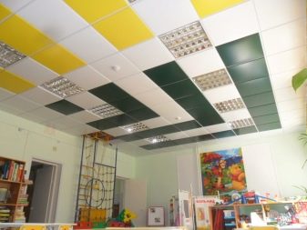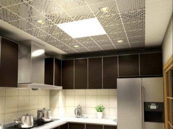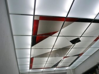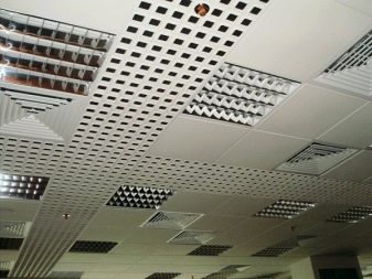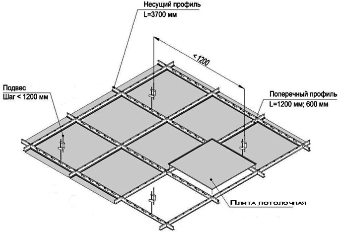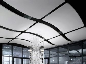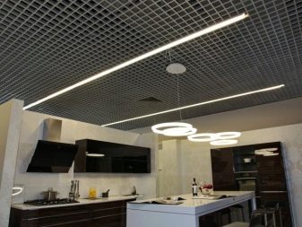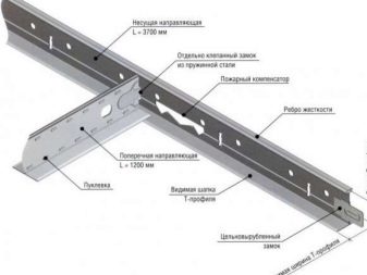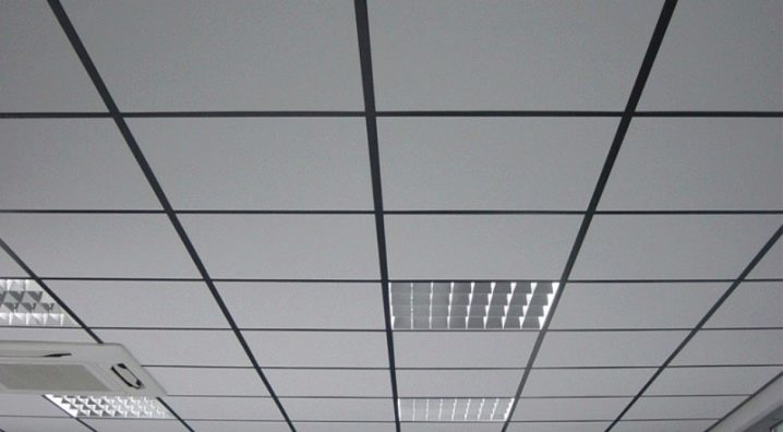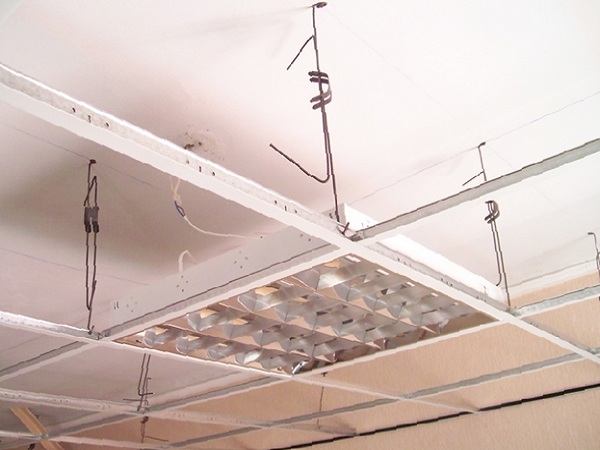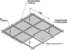 La conception ressemble à un système de profils, formant des cellules carrées ou rectangulaires. Les cellules sont des plaques et des lampes, et les profils eux-mêmes sont fixés au plafond avec des suspensions. Le système de suspension dissimulera avec succès les irrégularités, le câblage ou la ventilation, protégera du bruit (dans ce cas, des plaques avec des caractéristiques spéciales sont sélectionnées), permettra de réchauffer la pièce.