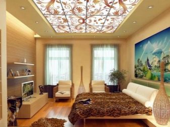La combinaison de plaques de différentes textures vous permet également de transformer un plafond standard en un plafond unique. Ainsi, la combinaison de panneaux acryliques avec éclairage et de panneaux conventionnels vous permettra de modifier à volonté la quantité de lumière dans la chambre à coucher, en mettant en valeur le plafond ou ses différentes sections.