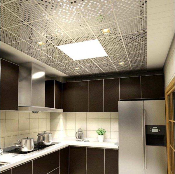 Dans les zones résidentielles avec un plafond carrelé, les gens expérimentent souvent. Par exemple, des carreaux plus légers peuvent être placés autour des appareils d'éclairage - cela ajoutera au placement de la lumière. Une option intéressante - des taches de couleur chaotiques sur un fond blanc, argenté ou noir. Dans les intérieurs des salles et des cuisines modernes, un «échiquier» ou tout autre «motif» en mosaïque est impressionnant (sa complexité n’est limitée que par la taille de la pièce).