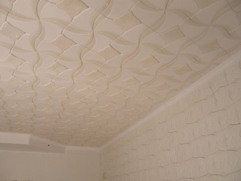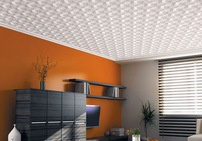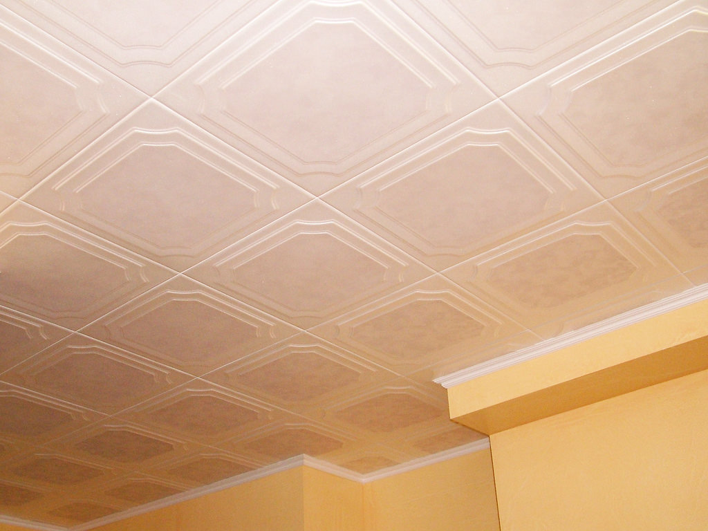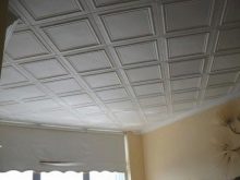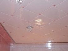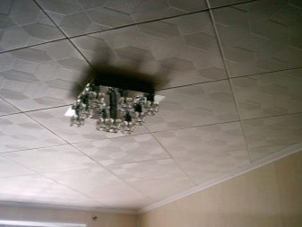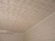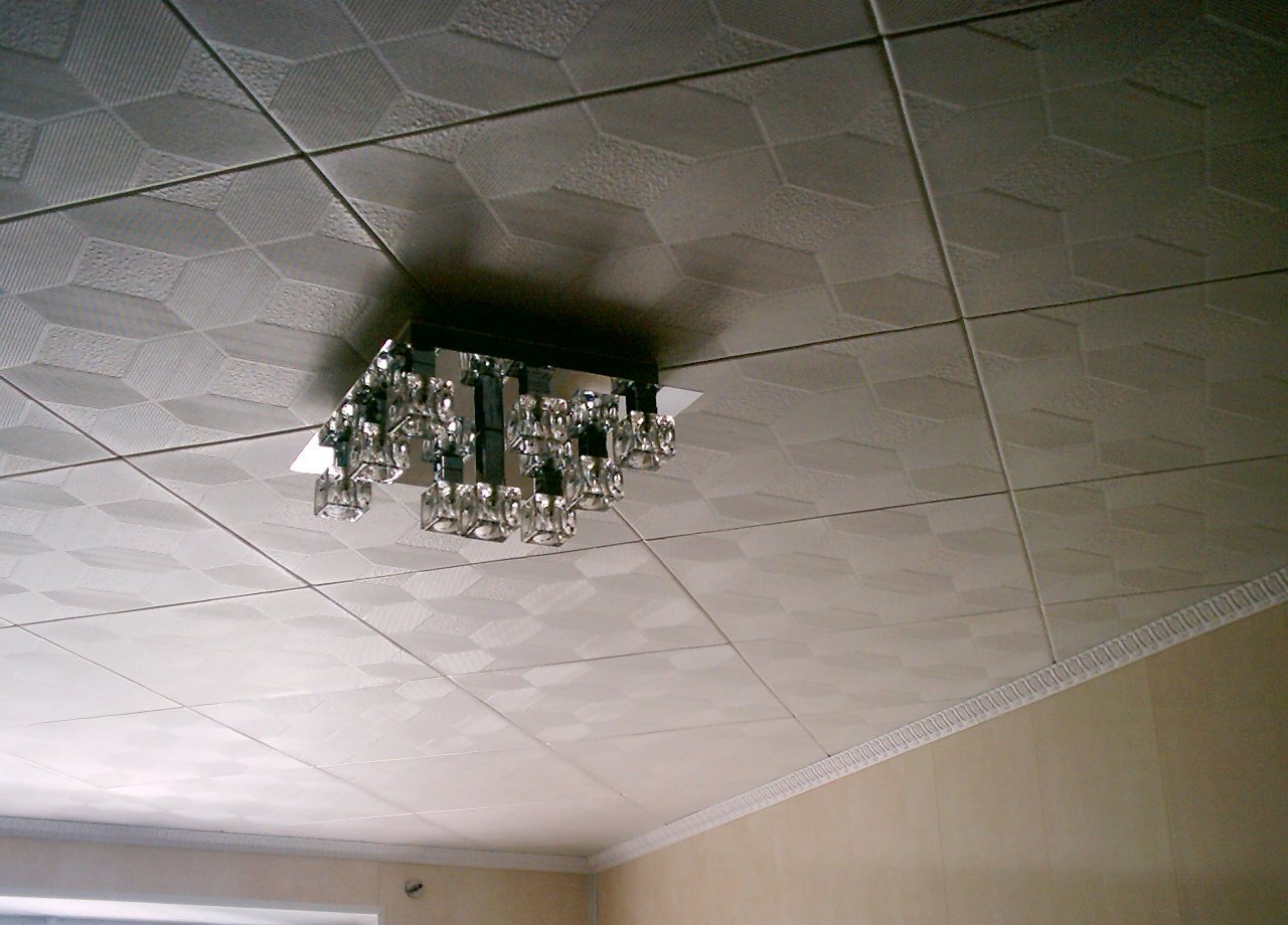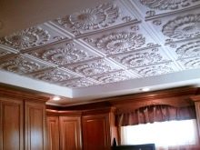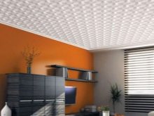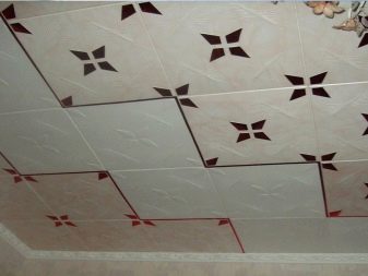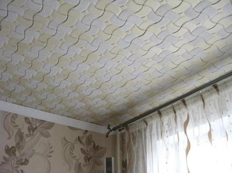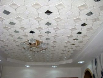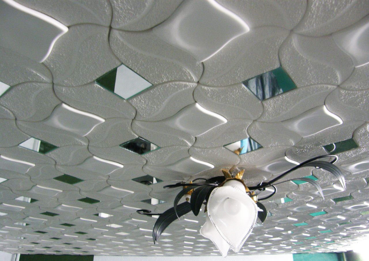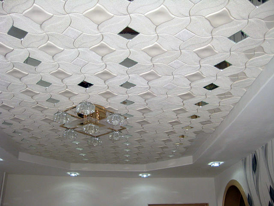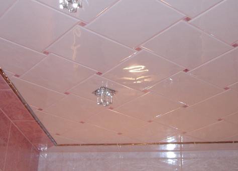 En effectuant la finition de cette manière, des motifs intéressants peuvent être obtenus sur la surface du plafond, ils sont répartis uniformément sur toute la base, mais souvent former des coutures, donc pour une finition parfaite, il est recommandé d'acheter un carrelage spécial sans soudure. Ses panneaux sont caractérisés par une nuance blanche comme neige et sont magnifiques dans des pièces spacieuses.