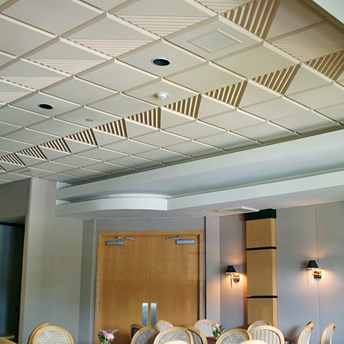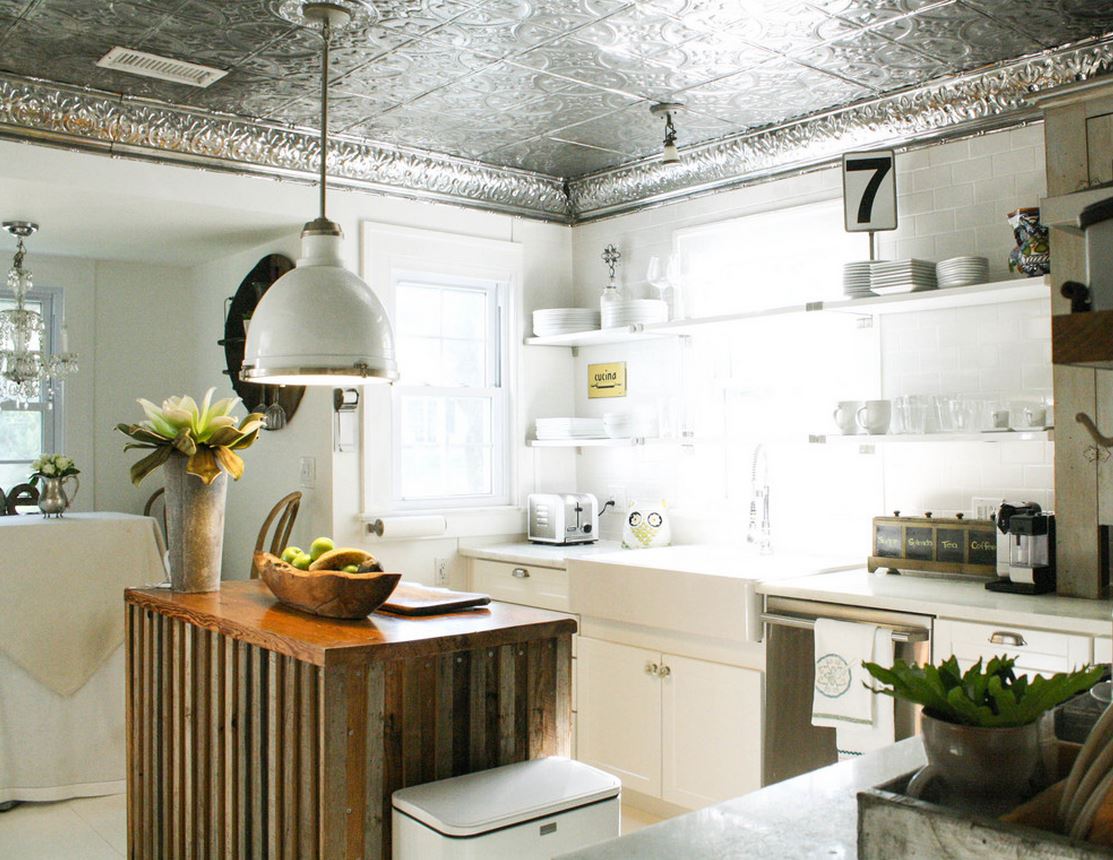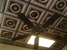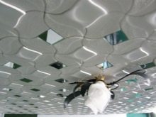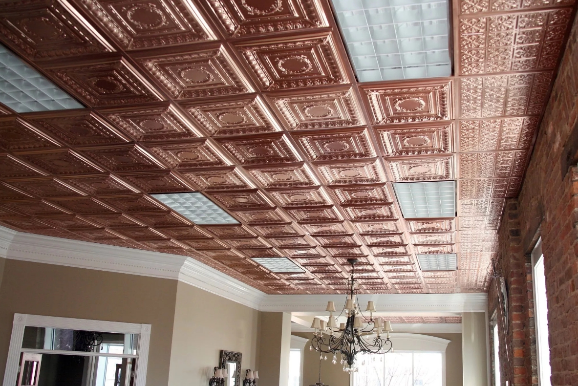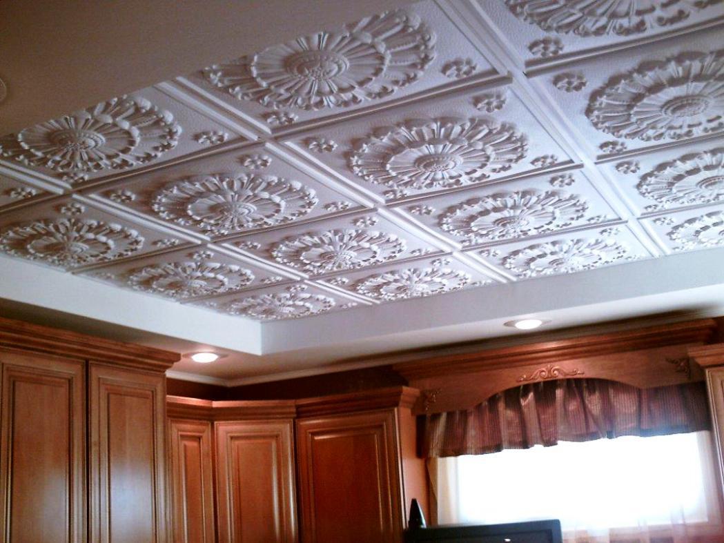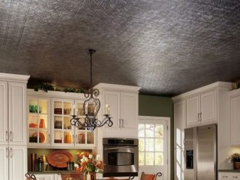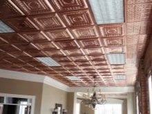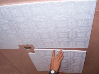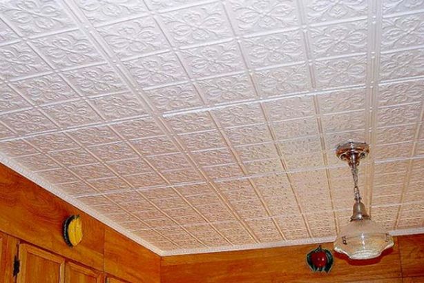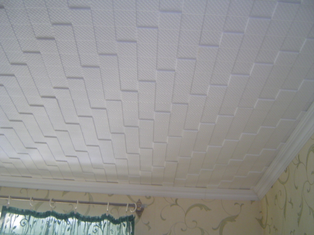En effectuant la finition de cette manière, des motifs intéressants peuvent être obtenus sur la surface du plafond, ils sont répartis uniformément sur toute la base, mais souvent former des coutures, donc pour une finition parfaite, il est recommandé d'acheter un carrelage spécial sans soudure. Ses panneaux sont caractérisés par une nuance blanche comme neige et sont magnifiques dans des pièces spacieuses.