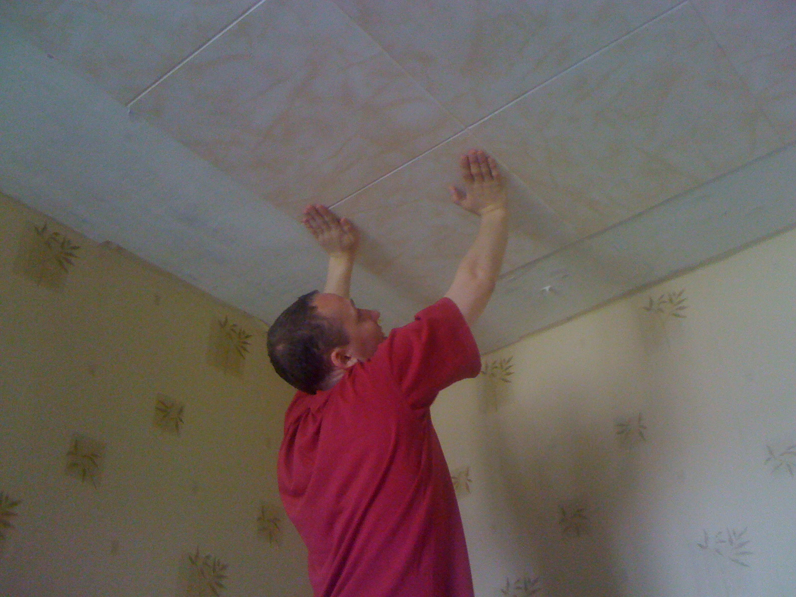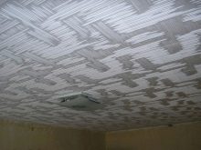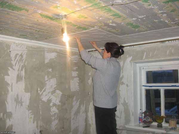 - L'installation de la dalle est réalisée sur le plafond préalablement préparé, de sorte que sa surface doit être soigneusement nivelée et apprêtée. Bien entendu, cela entraîne des coûts supplémentaires, mais si vous n'éliminez pas les défauts visibles, le matériau de finition peut répéter tous les renflements.