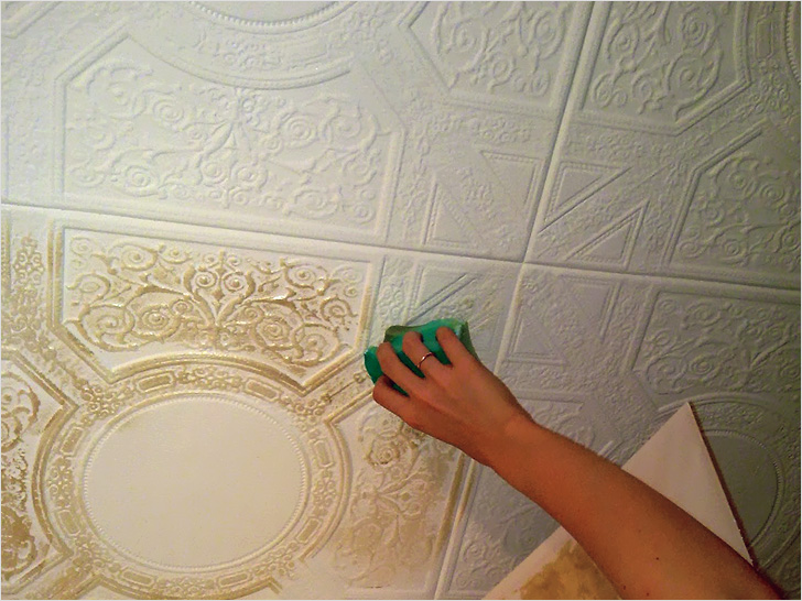 Il convient de noter que le carreau de mousse peut non seulement être peint, mais également blanchi. Cette option convient particulièrement aux pièces très humides.