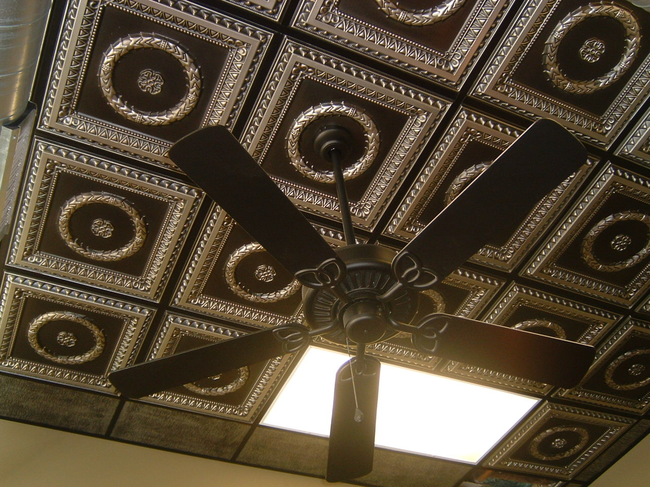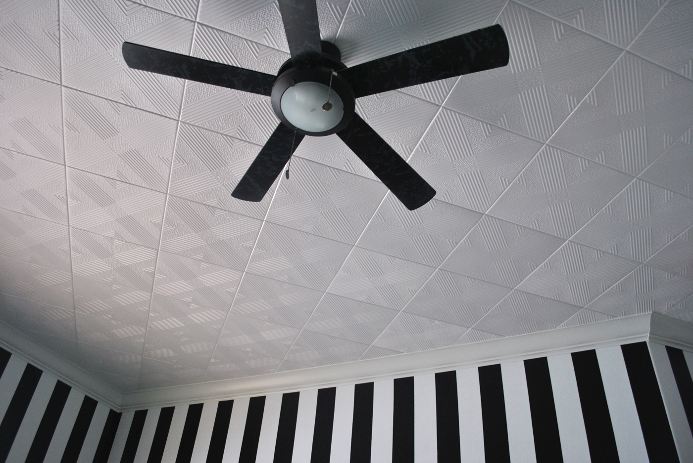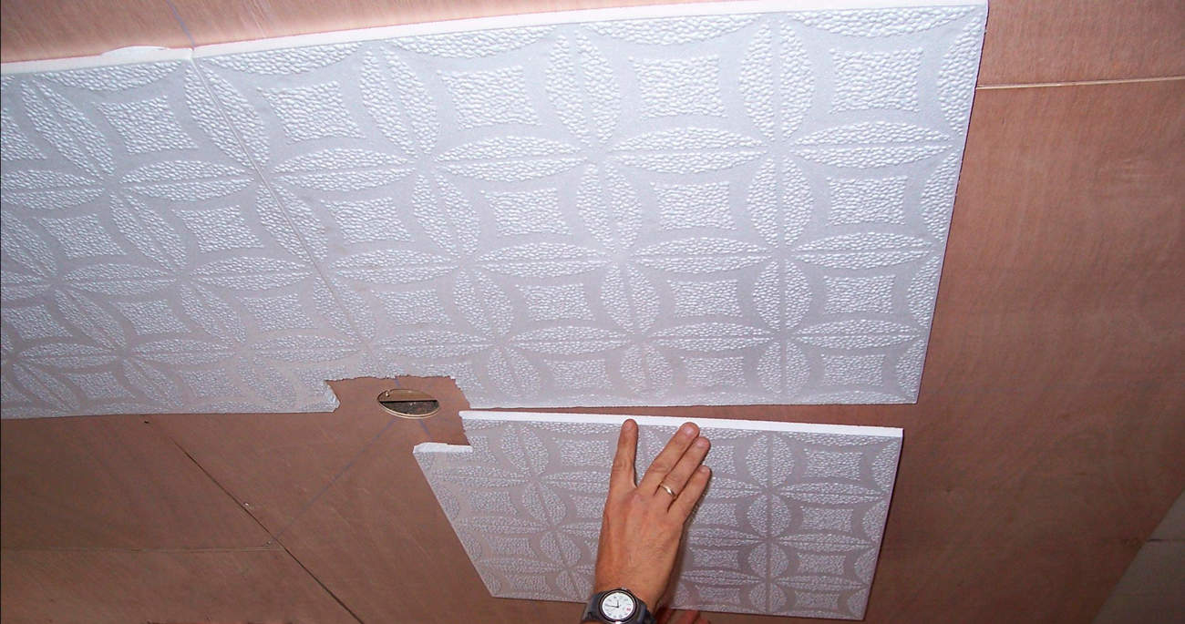 Quant à l’installation en diagonale, elle commence au centre du plafond. Si le lustre est prévu pour être placé au centre, les bords des panneaux sont rognés et le trou résultant est alors facilement fermé avec un bouchon.