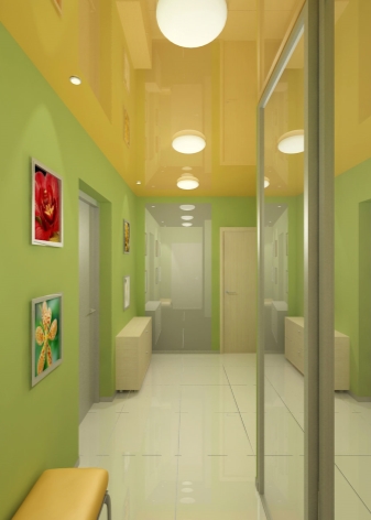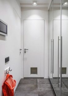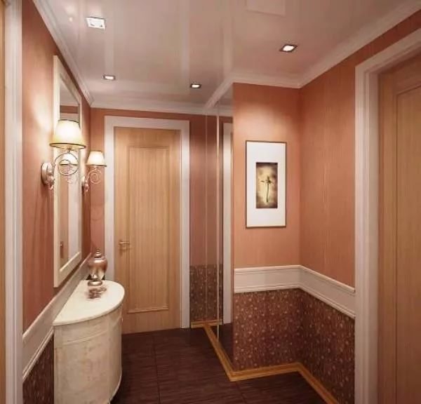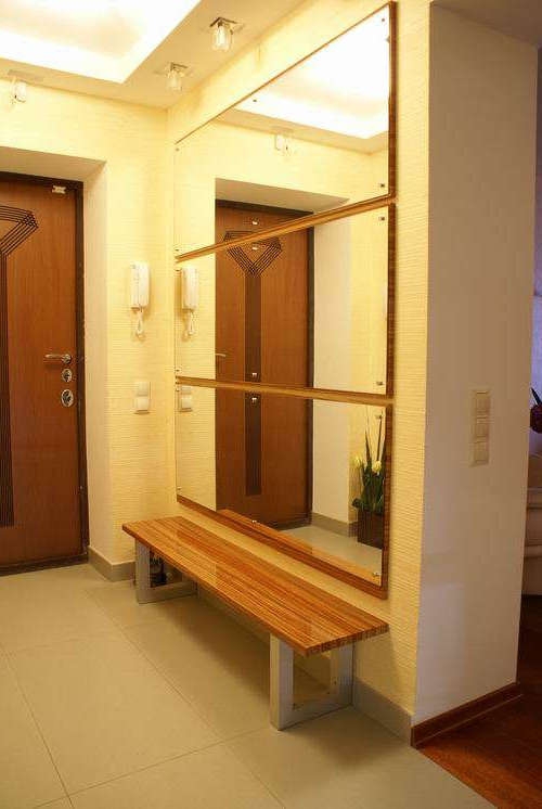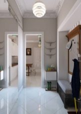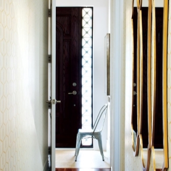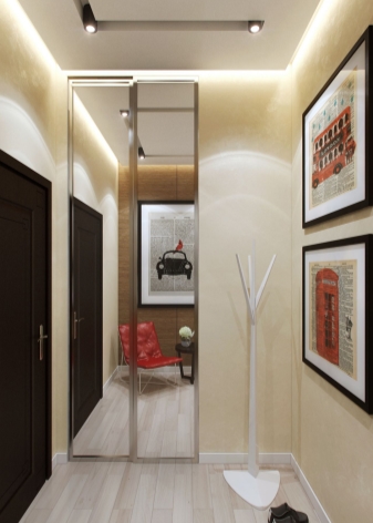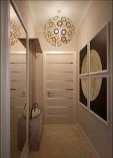 Pour une augmentation visuelle du couloir dans le Khrouchtchev, on peut utiliser un certain nombre de méthodes connues. Ainsi, afin d'élargir un couloir étroit, il est préférable de dessiner un mur transversal de couleurs plus claires qu'un mur longitudinal et une telle conception devrait être similaire en général. Pour étendre la surface au sol, la méthode du couloir de miroirs est également utilisée.Pour ce faire, de grands miroirs sont suspendus aux murs opposés. De plus, des fenêtres et des miroirs sont également montés sur les portes.