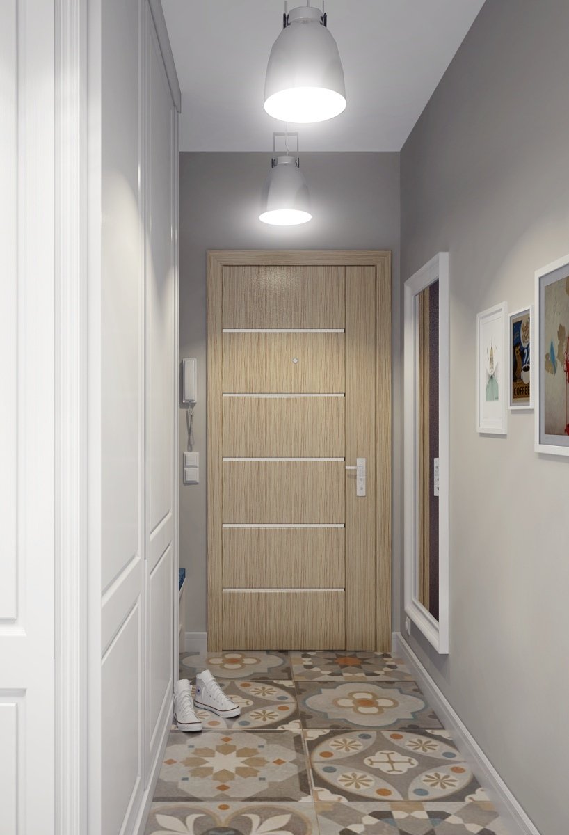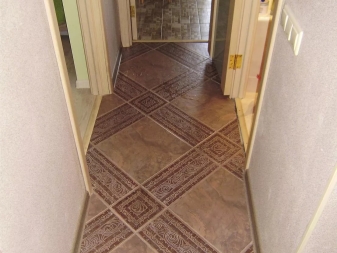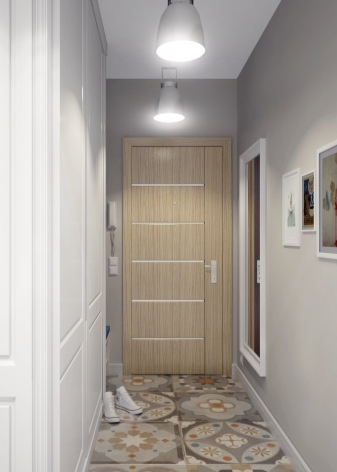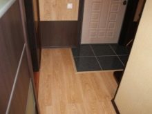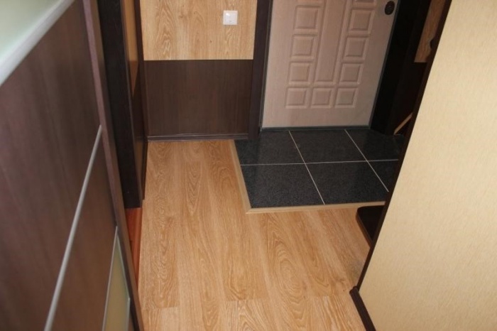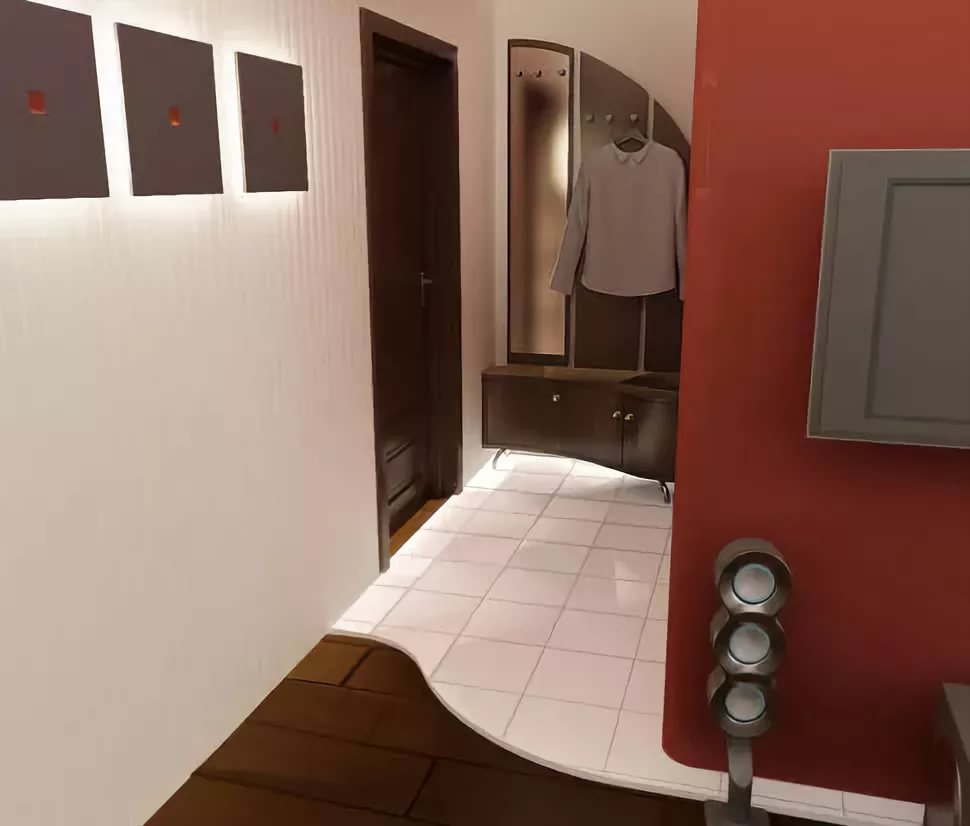 Les revêtements de sol peuvent contribuer à l'expansion visuelle d'un petit couloir Khrouchtchev. Ainsi, il est possible de poser l'entrée avec des carreaux et de changer le dressing et le couloir avec du parquet, ce qui se poursuivra dans les autres pièces.
