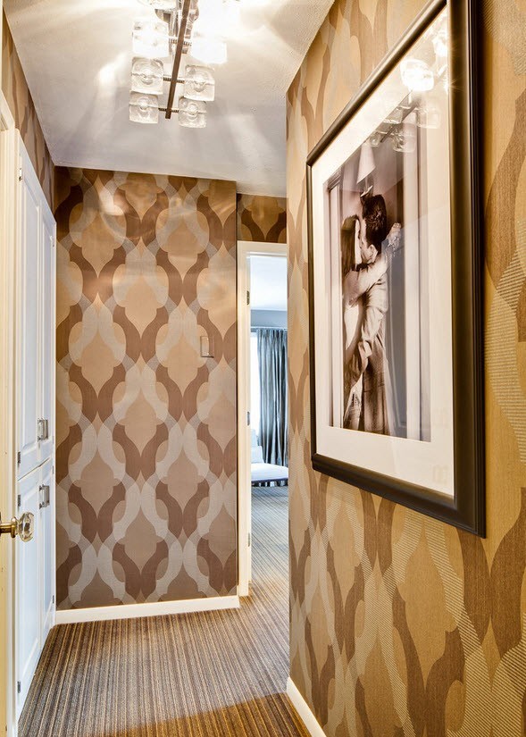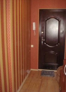 Pour la décoration des murs, il est préférable d'utiliser du papier peint classique en vinyle ou non tissé. Les vinyles conviennent parfaitement aux murs d'une telle pièce., car ils sont assez faciles à nettoyer de la saleté. Le hall d'entrée est l'un des endroits les plus sales de l'appartement, car l'eau, la poussière et la saleté provenant de la rue peuvent tomber sur les murs et autres objets intérieurs. Le papier peint en vinyle peut être facilement lavé, ce qui ne peut pas être dit sur le papier standard. C'est pourquoi ils doivent privilégier le choix des matériaux de finition.