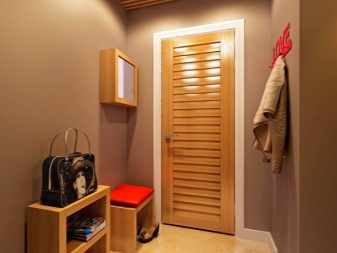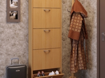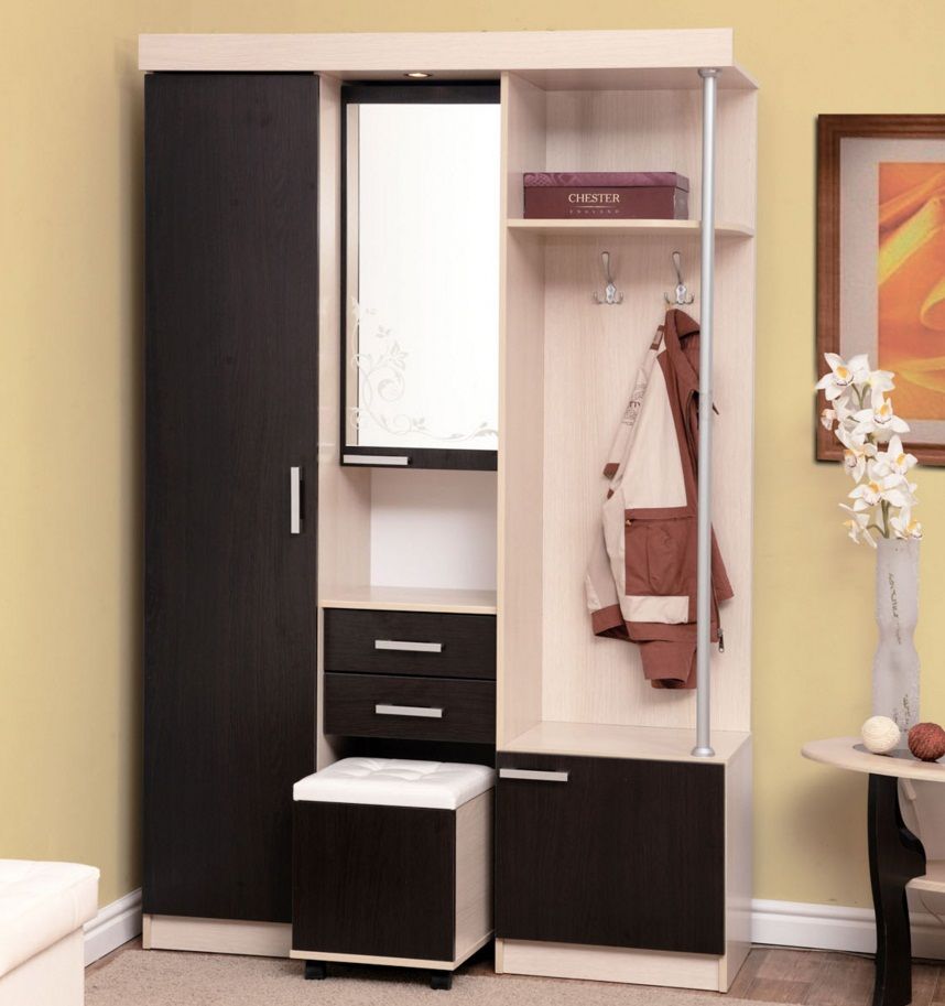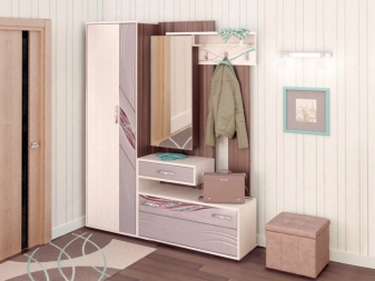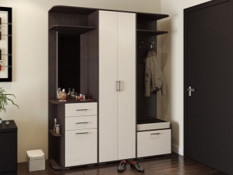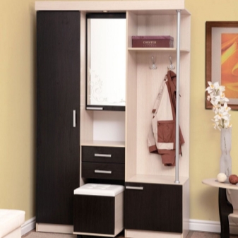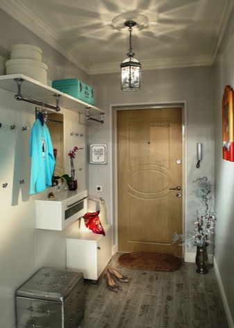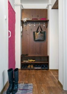 Pour les très petits couloirs, toutes les armoires ne conviennent pas.C'est pourquoi ils sont remplacés par des suspensions murales ou des poteaux. Ils sont généralement situés près de l'entrée. Également à Khrouchtchev pour l'ameublement, on utilise souvent des meubles anguleux. Vous pouvez ainsi occuper fonctionnellement les coins libres et économiser de l'espace.