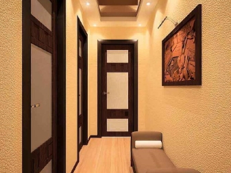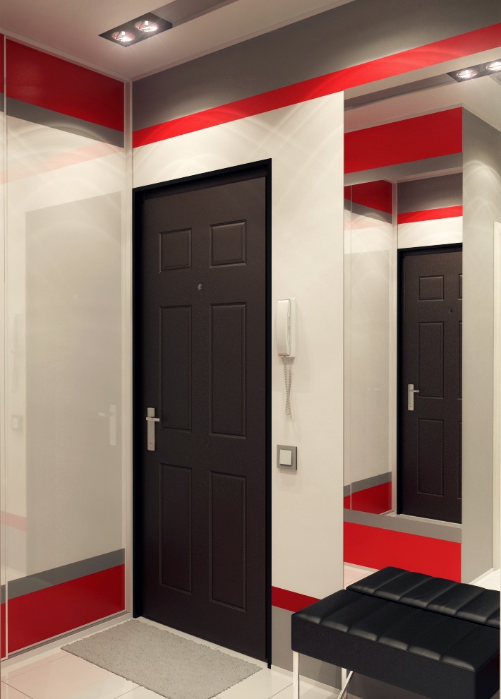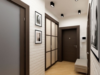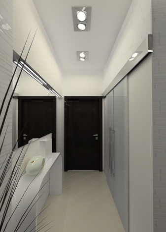 Tout petit couloir est fait dans une palette de couleurs claires. Il est souvent rempli de miroirs et d'éléments en verre. Couloir étroit dans la forme correcte de Khrouchtchev avec l'aide de meubles. Donc, le long du mur le plus étroit est généralement installé armoire. En règle générale, dans ces couloirs, de nombreuses sources d’éclairage différentes sont installées.