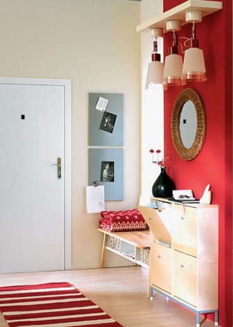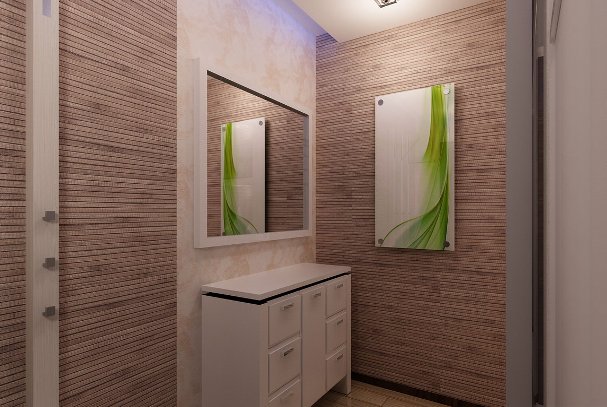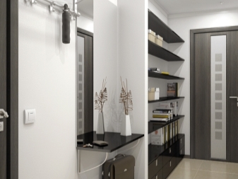 Dans un tel couloir, vous pouvez installer une armoire de toilette murale. Il est préférable de disposer de compartiments avec des étagères pour ranger certains accessoires, produits cosmétiques et autres objets nécessaires. Cette conception du couloir est assez populaire.