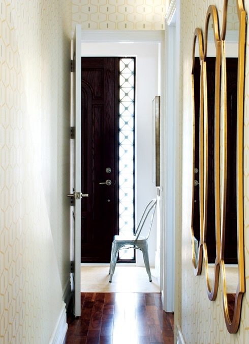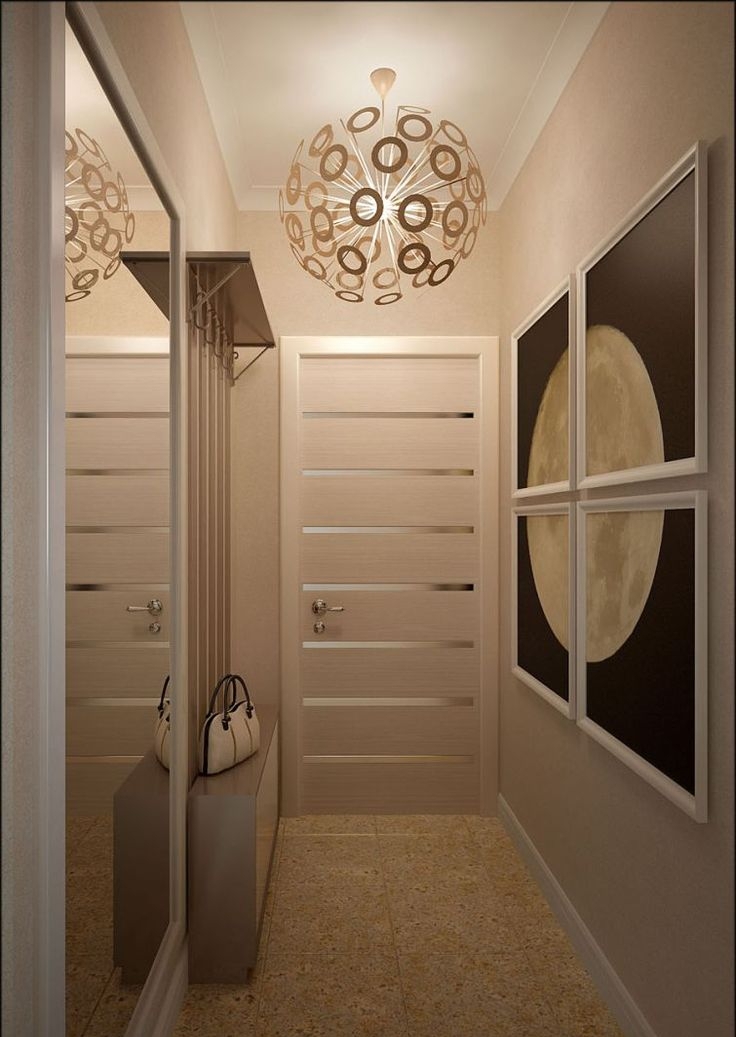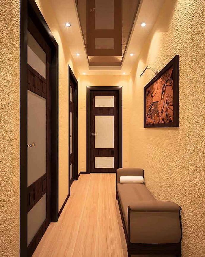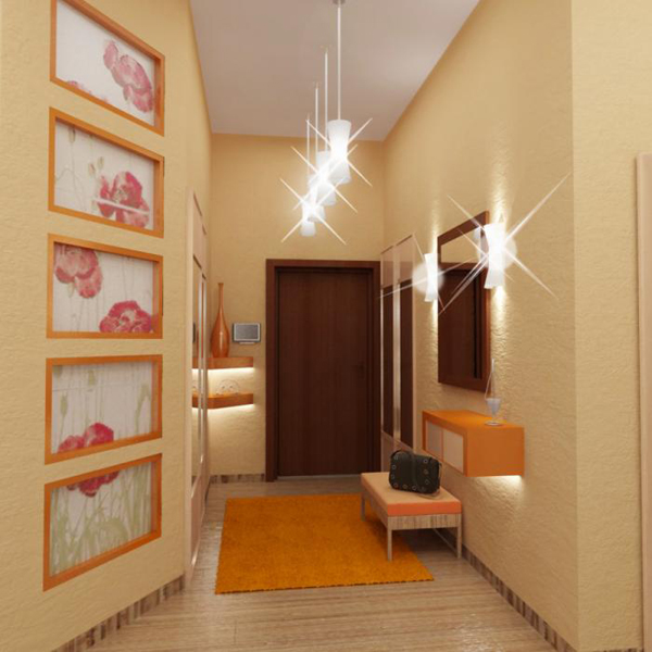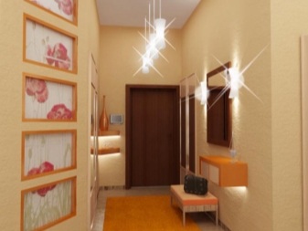 Sur le long mur situé dans le couloir étroit du Khrouchtchev, il est préférable de ne pas installer les lampes au centre, car vous pourrez ainsi le raccourcir. Cette solution ne convient que si vous souhaitez rapprocher la forme du couloir du carré.
