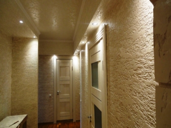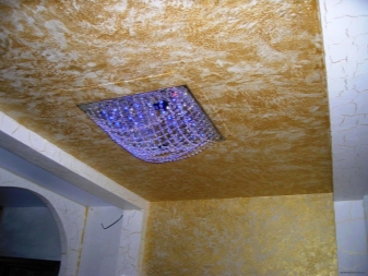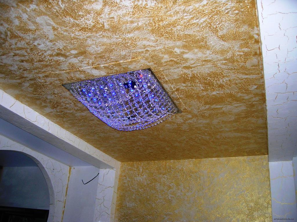 Pour finir le plafond, Khrouchtchev peut utiliser du plâtre décoratif. Seulement dans ce cas, vous devez utiliser ce revêtement pour la décoration murale. Ainsi, vous pouvez créer un ensemble unique unique qui étendra les limites de la pièce, ainsi que leur largeur et leur largeur. Le plâtre est très élégant et original.