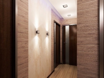 Afin d'élargir le corridor étroit de Khrouchtchev, vous pouvez vous débarrasser de l'éclairage du plafond et diriger les rayons lumineux vers différents murs. Pour que le plafond soit visuellement plus haut, il faut au contraire diriger les rayons de lumière vers le haut. Il est préférable que les appliques murales soient situées au-dessus ou au-dessous du niveau de croissance humaine, car vous pourrez ainsi uniformiser l'éclairage, en soulignant les murs et le plafond.