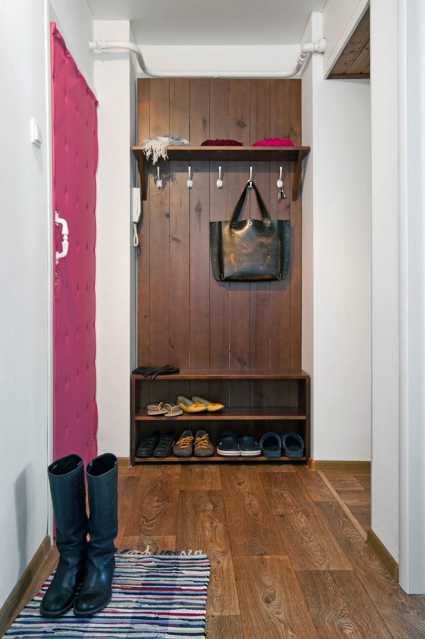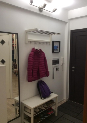 Juste en dessous du milieu du mur, vous pouvez installer des crochets sur lesquels vous pourrez suspendre des sacs, des sacs à dos et des écharpes. Là, vous pouvez également accrocher des brosses pour chaussures. Si vous souhaitez installer un système de stockage fermé sous la forme d'une armoire, il est préférable de privilégier les options intégrées. Ils occuperont très peu de place, car ils manquent de murs.