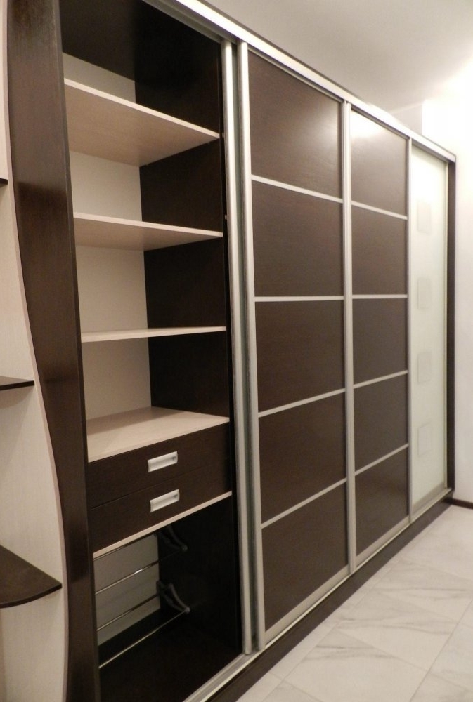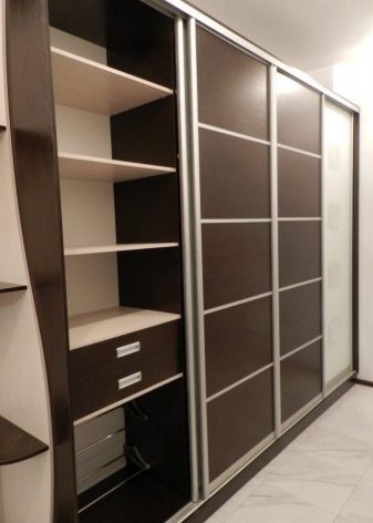 La garde-robe peut être construite dans un coin ou placée le long du mur. Il est généralement très haut, la hauteur de la pièce sera donc utilisée aussi fonctionnellement que possible. Un tel système de stockage fera une garde-robe de la garde-robe habituelle, où vous placerez les vêtements de dessus, et les accessoires, et des choses plus légères.