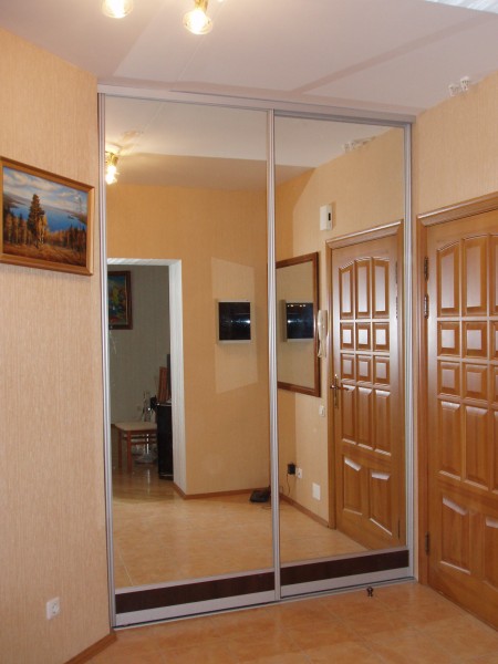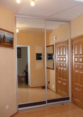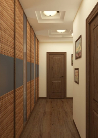 Pour Khrouchtchev avec un long couloir, des armoires étroites sont parfaites. Il est préférable qu'une telle construction ait un long miroir intégré dans le vantail de la porte. Cela créera un couloir de miroirs et remplira le couloir de lumière, le rendant plus spacieux. Cette conception ne nécessite pas d'espace pour ouvrir la porte et est donc très économique en taille.