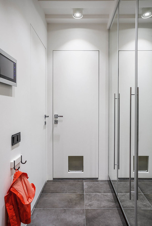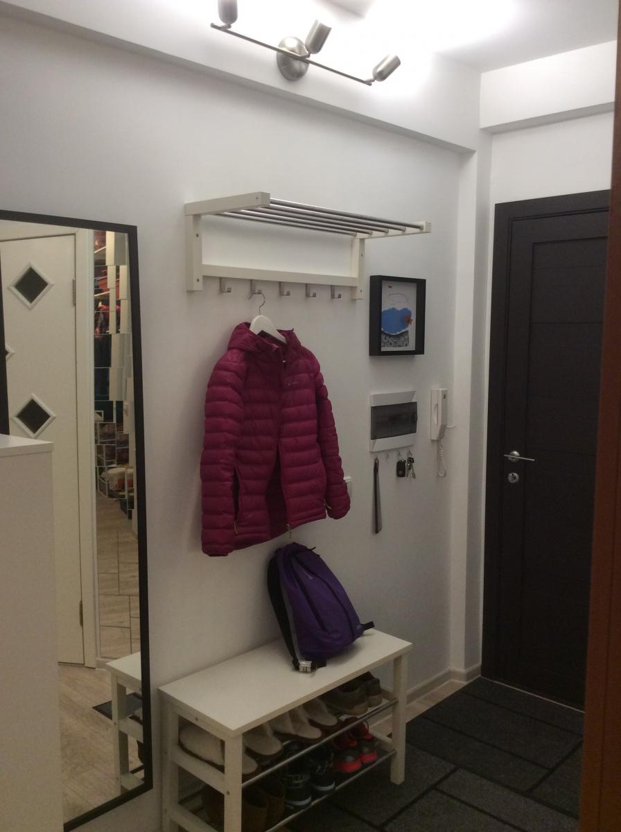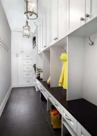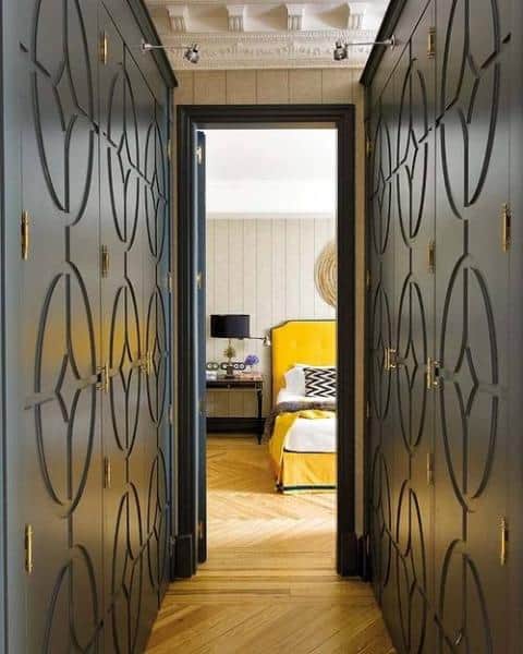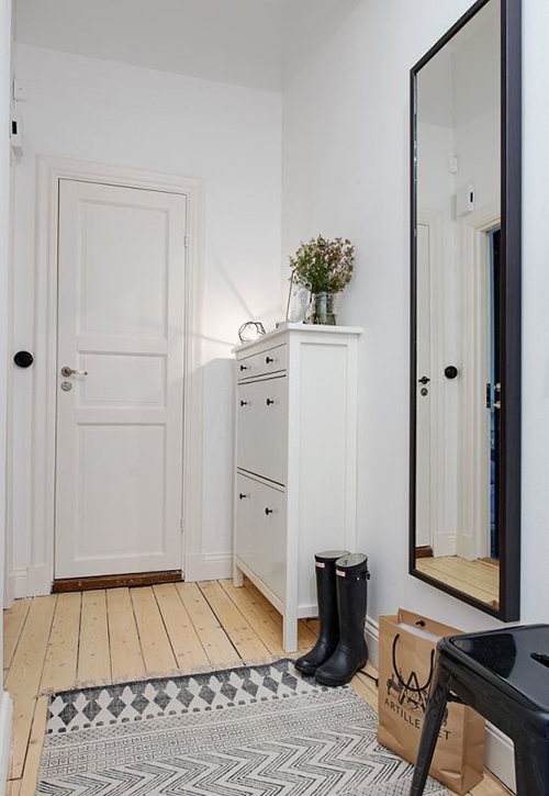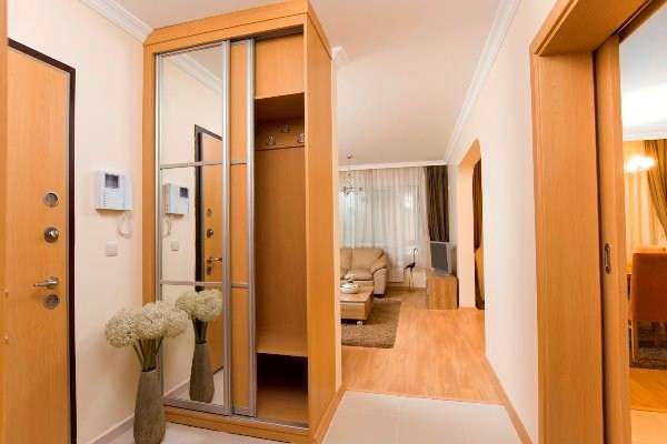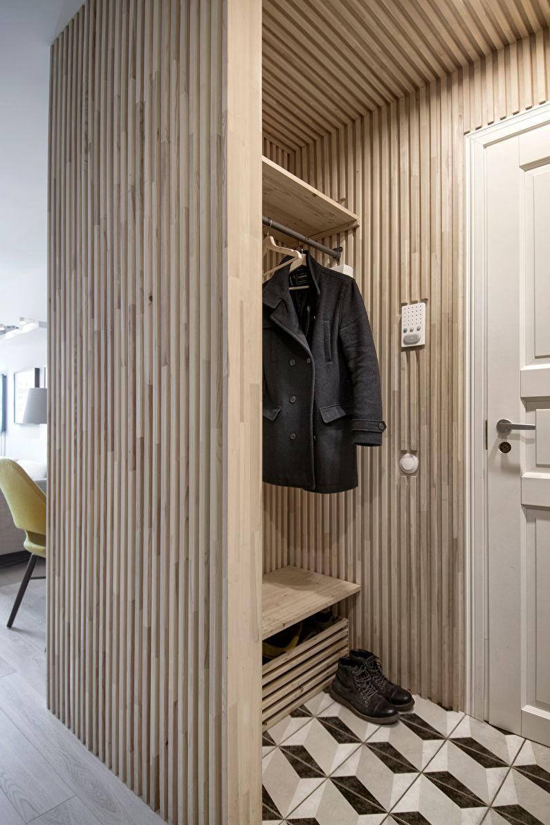 Lors de la fourniture de cet espace, il est important de garder à l’esprit que il devrait avoir plusieurs domaines fonctionnels: un endroit pour se déshabiller, changer de chaussures et ranger ses chaussures, ainsi qu'un système de rangement pour les vêtements. Le dressing doit être aussi spacieux que possible et occuper une surface d’environ 80 x 80 cm.Un placard étroit pour ranger les vêtements et une mini bibliothèque pour ranger les chaussures doivent être placés sur l’espace restant.