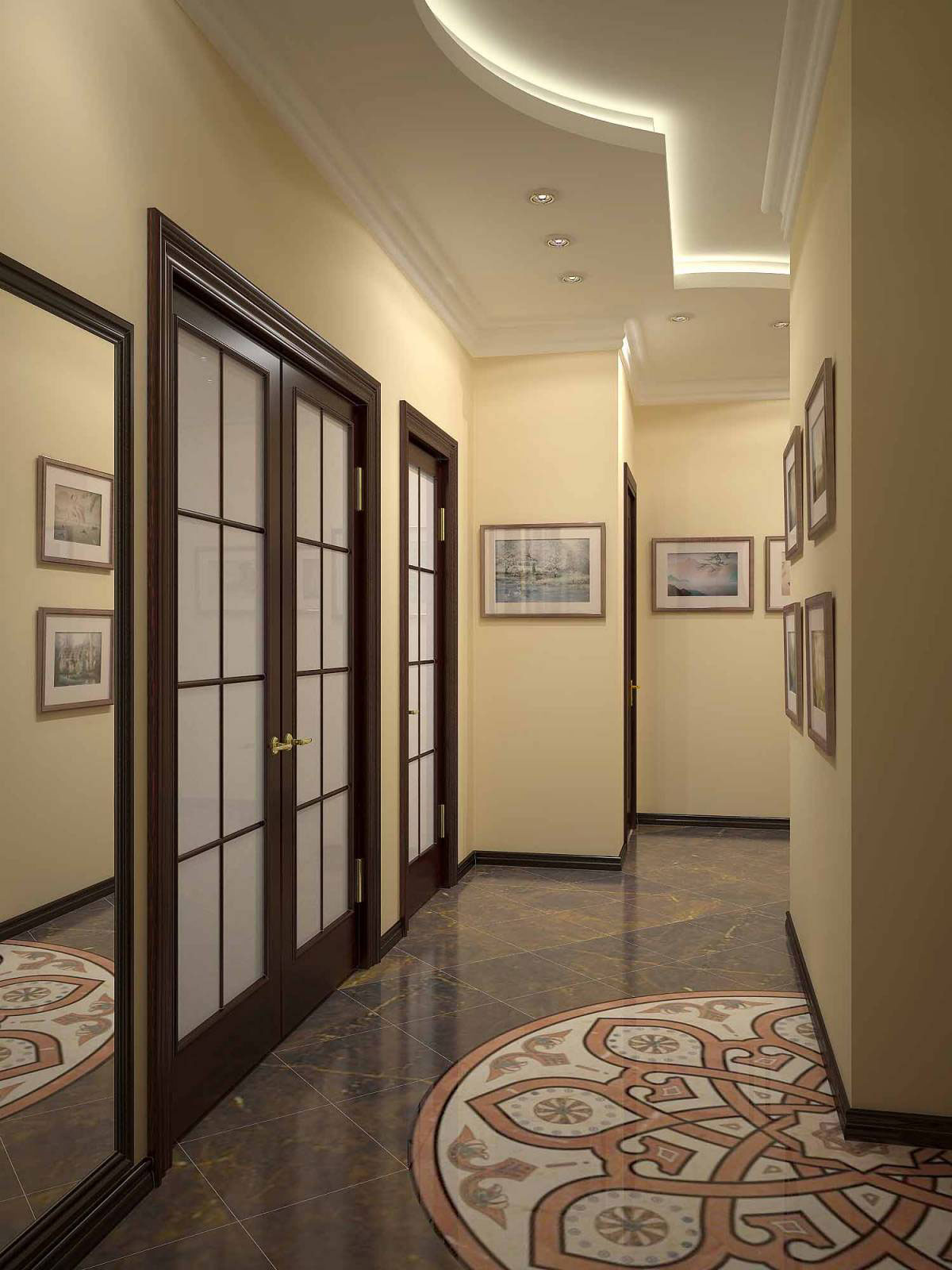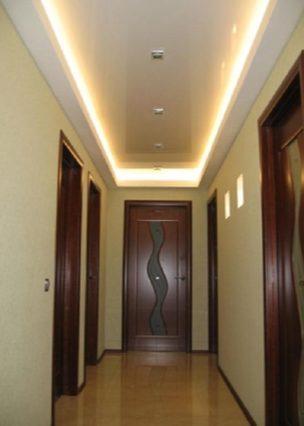 La plupart des appareils d'éclairage doivent être situés le long du mur le plus long du couloir. La lumière est préférable de diriger vers les murs opposés et vers le haut. Ainsi, vous pouvez jouer avec la lumière et placer des accents de lumière. Essayez d'éliminer la présence de coins sombres et de créer un éclairage avec une lumière douce et diffuse.