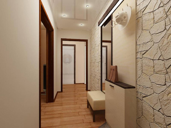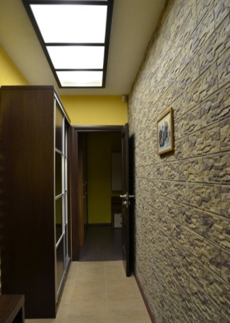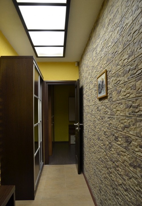 Essayez également de jeter les panneaux en plastique et la pierre. Valide est seulement une pierre artificielle de nuances claires. Un tel élément décoratif peut rendre le couloir intérieur plus facile et plus élégant. Lorsque vous organisez, abandonnez également les panneaux en plastique, car ils réduisent également l’espace. La finition peut être réalisée en peignant les murs.