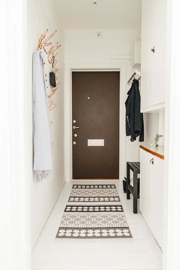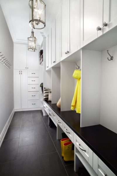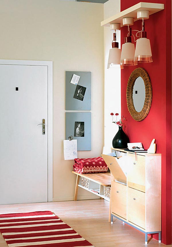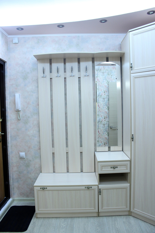 Dans cette pièce, vous pouvez également installer une petite armoire. Vous pouvez y ranger des chaussures, des accessoires, des parapluies et d’autres objets, ainsi que l’utiliser comme siège. Vous pouvez installer des supports muraux sur lesquels vous pouvez suspendre des vêtements sans utiliser de grands meubles. Au-dessus des cintres, il est habituel de fixer une étagère pour les chapeaux et les foulards. Ce système de rangement ouvert est complété par des tablettes inférieures permettant de placer les chaussures à plusieurs niveaux.
