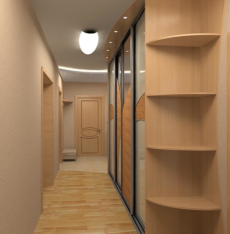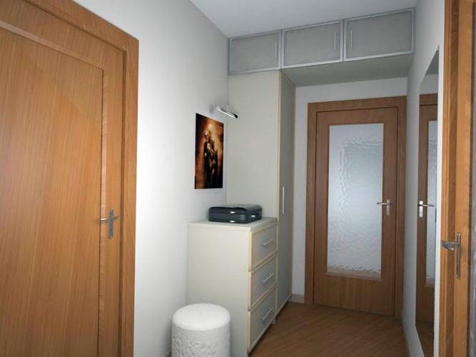 À Khrouchtchev avec un couloir étroit, vous pouvez créer une atmosphère confortable. Ainsi, tous les grands meubles dans de tels locaux peuvent être placés le long d’un mur. L'option la plus acceptable pour cela est une grande armoire, qui combine tous les systèmes de stockage et remplace les autres meubles. Ses portes coulissantes vous permettent de gagner de la place dans la pièce et de dépenser un zonage rentable.