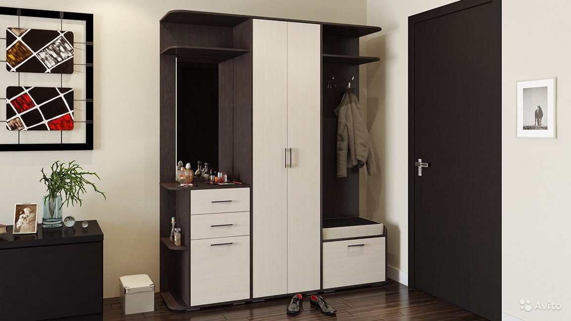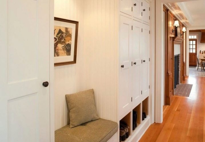 Pour le couloir, utilisez souvent des meubles encastrés, en raison de l'absence de certains murs, ils prennent moins de place et sont plus spacieux à l'intérieur. Pour aménager un petit couloir dans le Khrouchtchev, veillez à utiliser les chaussures ou les pouces. Ces meubles permettent de cacher des chaussures et de libérer de l'espace à l'entrée. Il est préférable d'utiliser des meubles plus hauts pour la décoration.