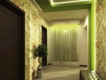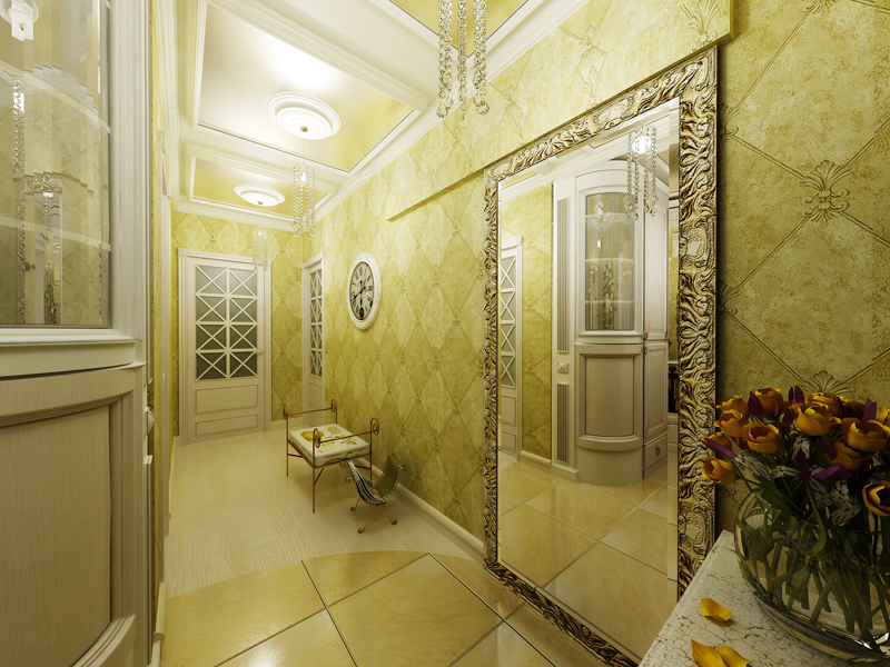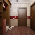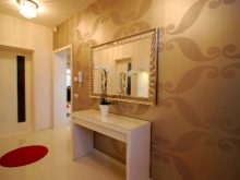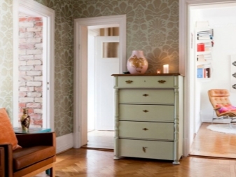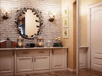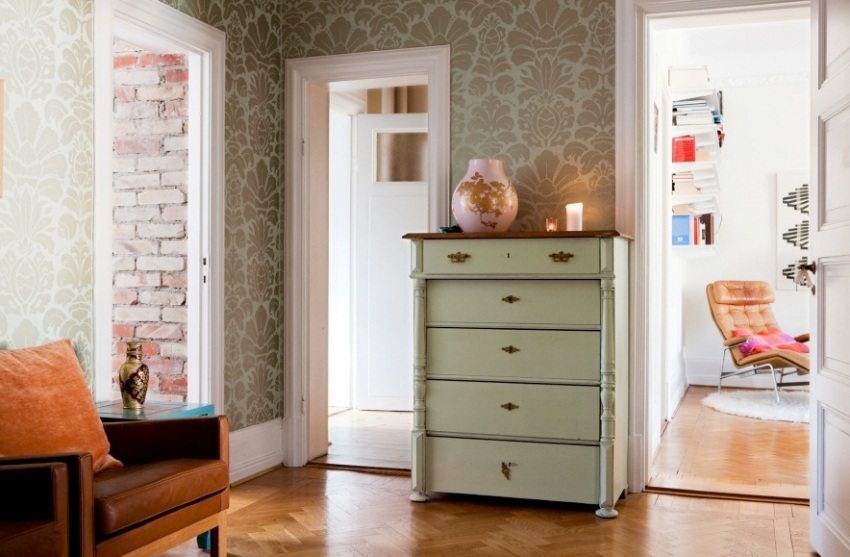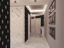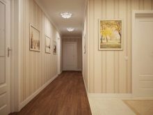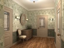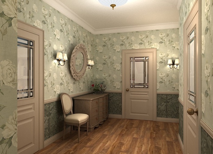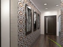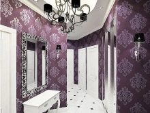 Pas moins harmonieusement dans le long couloir du papier peint poudré "Khrouchtchev" avec un simple imprimé végétal.Une petite dentelle avec des boucles rendra la pièce plus spacieuse, et le miroir et les peintures détourneront l'attention du manque d'espace.