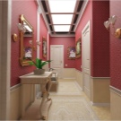 Un autre effet important, ils choisissent donc des contrastes et des accents clairs. Dans le premier groupe de tons les plus pertinents à l’intérieur du couloir sont les peintures marron, violet, bordeaux, vert, orange et rouge. La gamme calme comprend le blanc, le jaune, le beige, le lilas, le bleu et le turquoise. En outre, les tons gris-rose et menthe pertinents. La peinture noire et grise ennuie, donc à l'intérieur du couloir, ils sont inappropriés.