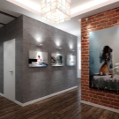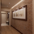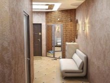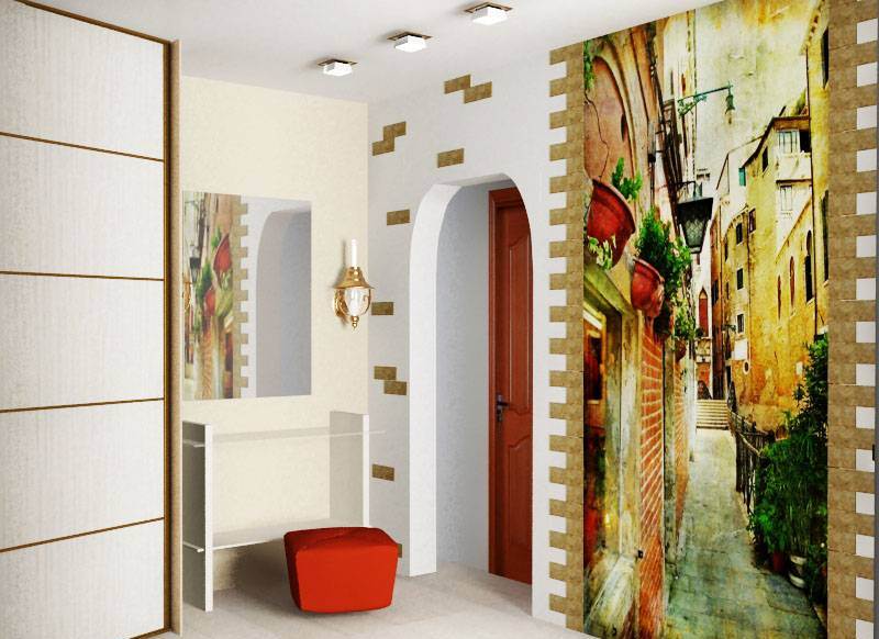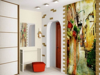 La conception du couloir avec une arche peut être faite avec l'utilisation de papier peint sous la forme de briques, tout en soulignant la porte en blanc.
