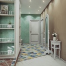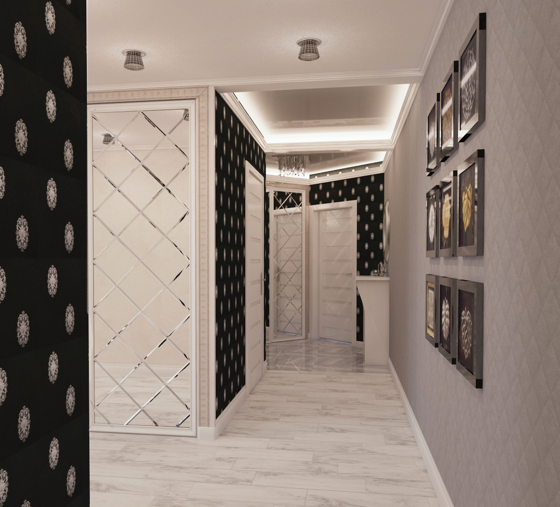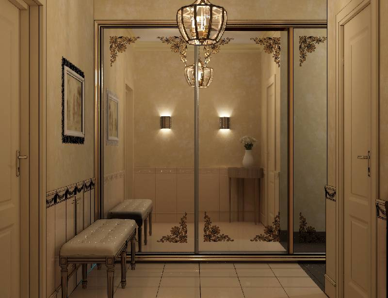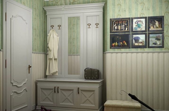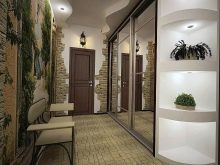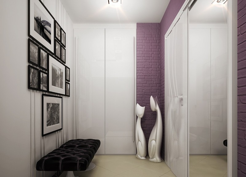 - Mettez en surbrillance la zone d'accent. Zonage des cintres, miroirs, vestiaires, contribuant à délimiter clairement la pièce (créant l’effet de l’organisation de l’espace);