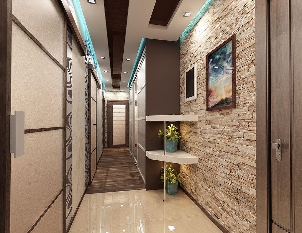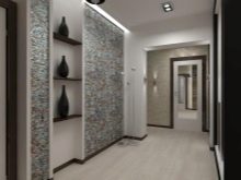 Pour un couloir étroit, de beaux papiers peints pour la pierre naturelle et un compagnon monochrome de la même teinte conviendront. En raison d'un motif simple, ils "étirent" l'espace.