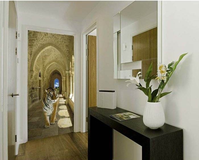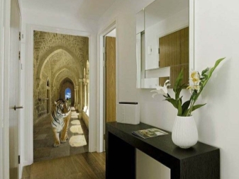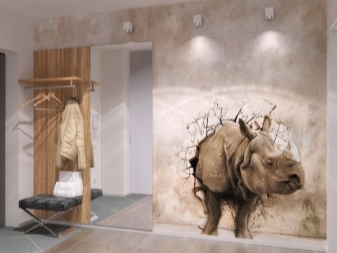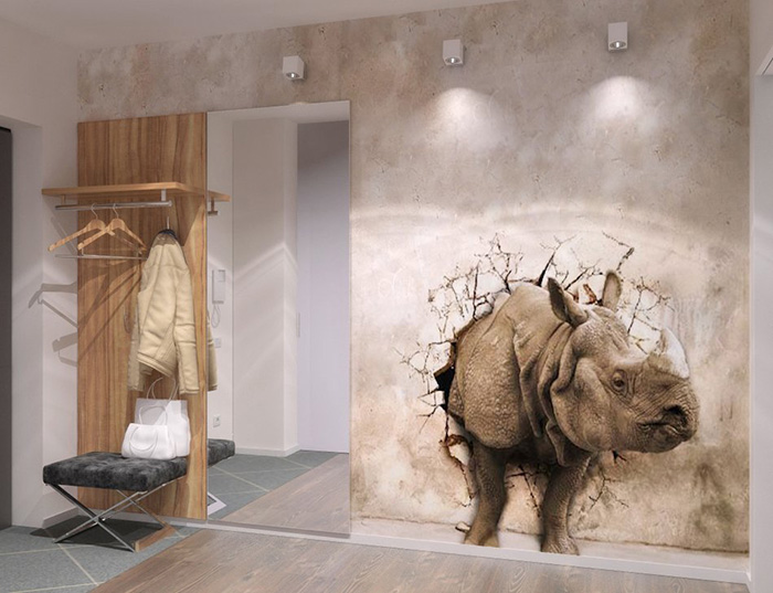 Le revêtement mural 3D comprend des papiers peints appliqués à une image numérique qui déforme l’espace et crée un effet de volume en trois dimensions. De telles toiles sont assez coûteuses, faciles à utiliser, résistantes aux dommages mécaniques, ignifuges. Leur seul inconvénient est qu’ils s’ennuient rapidement et pour le bon effet, vous avez besoin d'une longue distance.