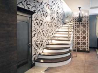 Pour une maison de campagne privée avec un couloir spacieux, vous trouverez un papier peint brillant avec un grand motif. Ils décoreront la pièce lumineuse en la remplissant d'accents clairs.