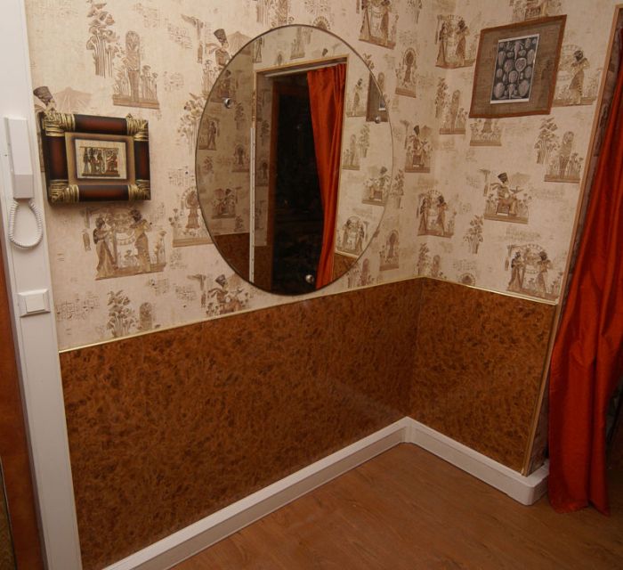 - Les papiers peints peuvent être collés sur des panneaux en plastique, pour lesquels le plastique doit être pré-apprêté en deux couches (le motif peut être chaotique, de manière décalée ou avec un seul accent), en décorant le motif avec des cadres pour un meilleur effet.