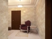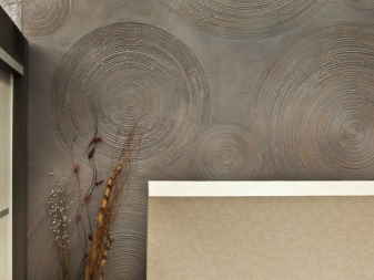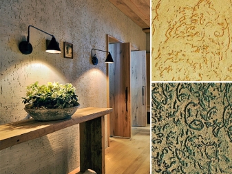 La texture inhabituelle du matériau rend le design du couloir intéressant, ce qui vous permet de le compléter avec diverses imitations sous forme de tissus, daim, papier, feuilles de palmier, velours et pierres naturelles. Le plâtre est appliqué de différentes manières, de sorte que la surface peut être à la fois lisse et en relief. De plus, le plâtre décoratif présente de nombreux avantages: